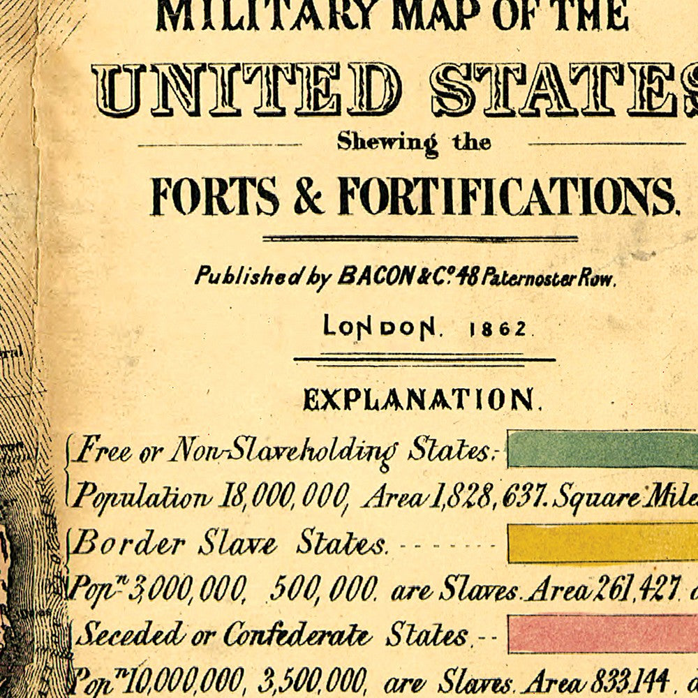 Bacon's Military Map of America, originally published in 1862 is a classic Civil War Military Map. This Map shows the forts and fortifications that existed during the time of the Civil War. The forts are named and marked by small flags. The map includes towns, railroads, names and boundaries of states and territories and is color coded to reflect the divide of the country during the war: "Free or Non-Slaveholding States" are colored green, "Border Slave States" are yellow, and "Seceded or Confederate States" are in red. Also marked on the map are Pony Express Routes and Wagon Trails such as the Oregon Trail and the Santa Fe Route that the early western settlers took. Printed on heavyweight matte art paper, this fascinating vintage looking historic poster is ready to frame, mount, or display as a poster directly on the wall.