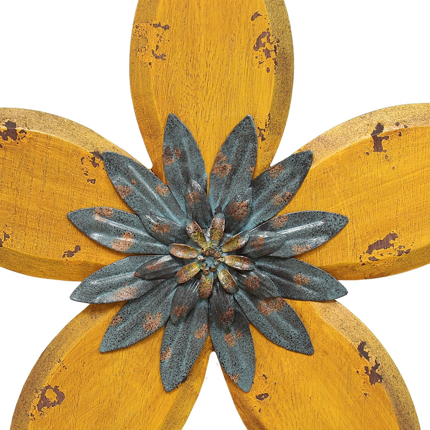 Create a long lasting impression by making a grand statement in home decor with our Antiqued Look Yellow and Gunmetal finish 3D Metal Flower Wall Art. This beautiful and rustic piece features a vintage inspired flower accented with a distressed golden yellow finish and an equally distressed gunmetal finishe core-center to elicit chic visual vibes in any room. Whether you need unique wall art in your study, dressing room or living room, this stunning accent piece will perfectly accentuate any room decor. Made of MDF and metal, this piece comes ready to hang and easily wipes clean with a damp cloth. 14.75" X 1.18" X 13.98".