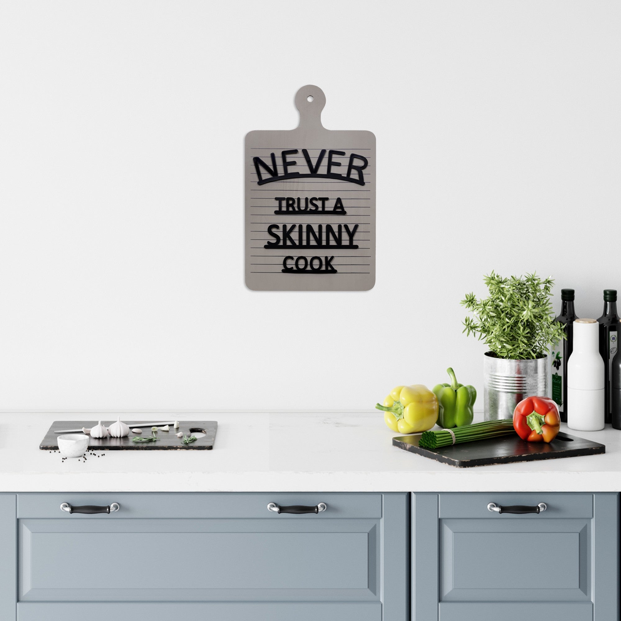Bring more whimsy to your kitchen with this Never Trust A Skinny Cook Wall Art. The back is made of wood and shaped like a hanging cutting board to keep in line with the kitchen theme. The back is colored to a light gray finish and has horizontal line detailing on the main body. The words 'Never Trust A Skinny Cook' are written in black metal on top. This fun wall art will elevate the look of any space in your kitchen or any other dining spaces easily. 19" H x 12" W x 0.75" D