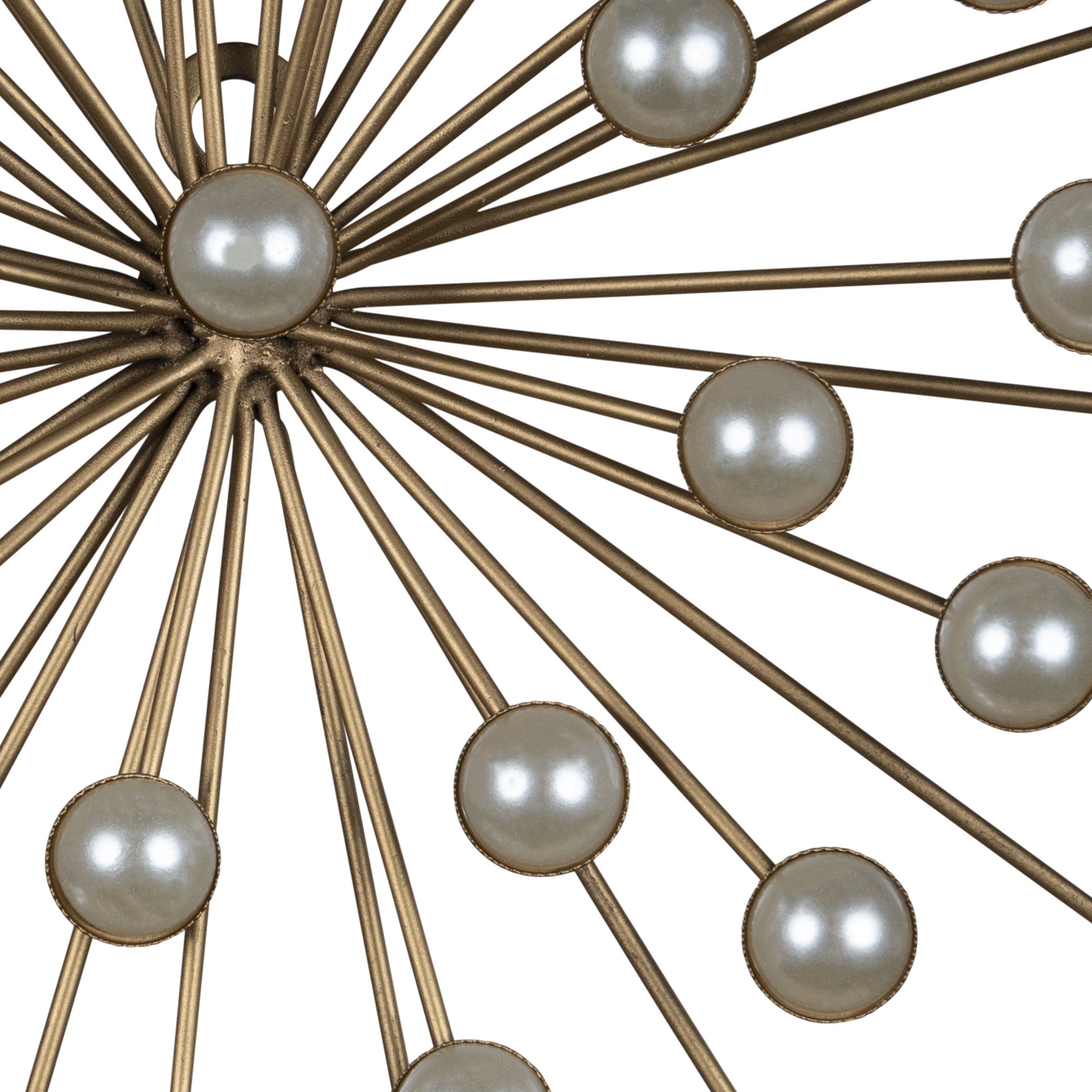 Elevate the aesthetics of your interior with this Set of 3 Pearl Starbursts Wall Decor that will spruce up your living space with a contemporary touch. The harmonizing hues, stylish construction, and fine details all just adds up to a spectacular decorative accent for your home. Showing off a starburst pattern, this 3-piece set flaunts handcrafted metal spokes in a golden matte finish with enchanting pearls on the ends for a visually rich and charismatic appeal. Each piece is carefully constructed with 50% metal and 50% acrylic to last for many years without losing its shine. It’s time to reflect your sense of modern styling with this stunning piece of art mounted on the wall. 10” x 10” x 1.5”