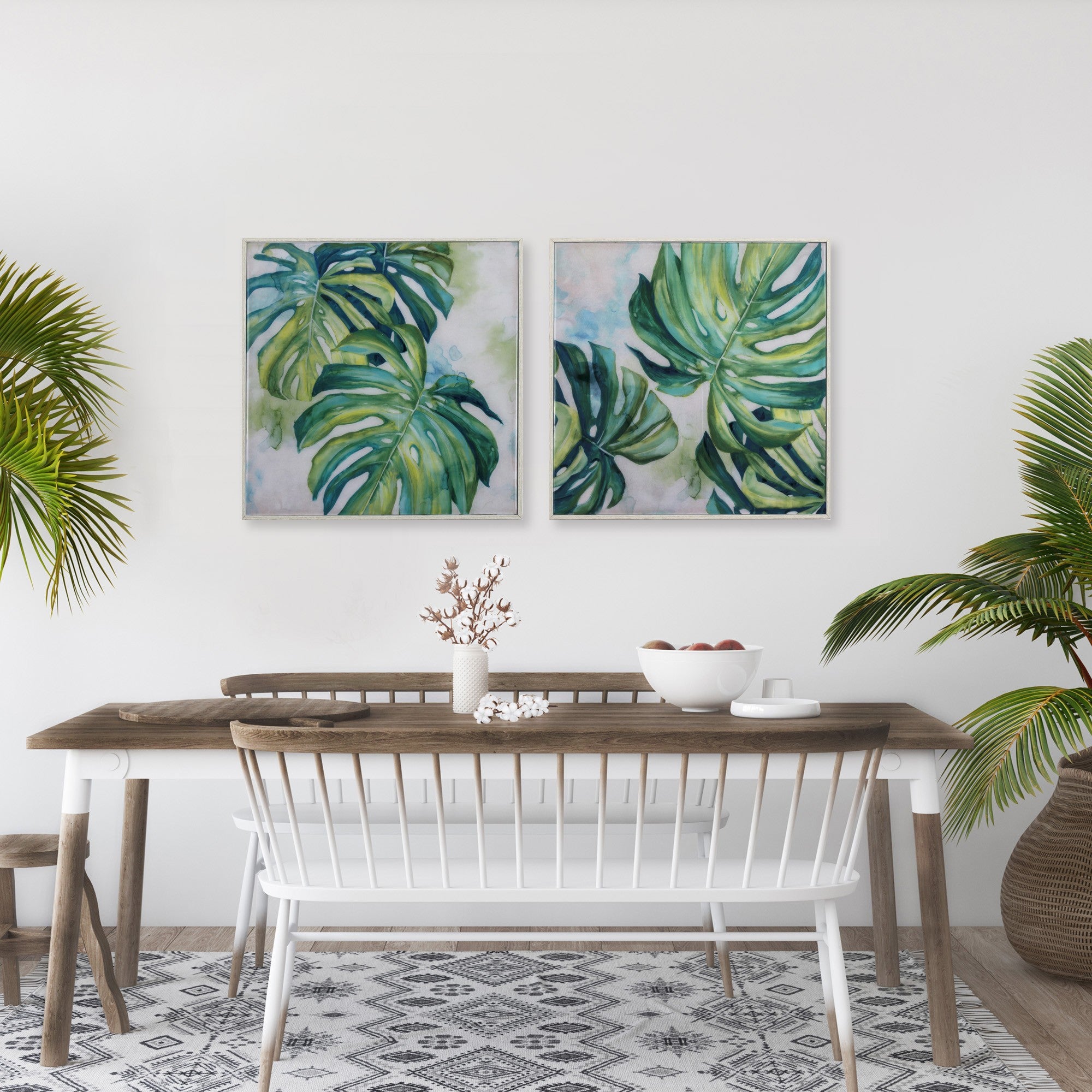 This pair of Summer Botanical Abstract Framed Art will be a great accent for your favorite space. Position together or separate, these botanical glitz images with an epoxy resin hand-applied, bordered in high-quality, light wood-toned frames. Ideal for coastal decor or anywhere you are looking for shades of green, these art prints will make a perfect way to liven up your space 16" x 16" x 1" each. Set of 2