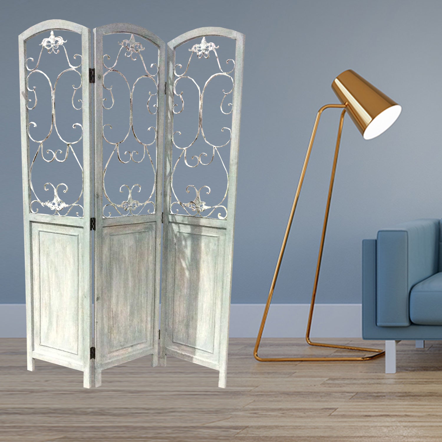 featuring a scalloped arched top, our 3 panel wood screen is designed to have a charming and exciting appeal on any home decor. it features an intricate scrolled metal artwork on each of the panel giving it the del rios screen unique character. this screen is made of hardwood with a distressed washed finish. this screen will definitely fill your space with inspiring visual flair for many years to come. 3 panel screen intricate scrolled metal artwork scalloped arched top