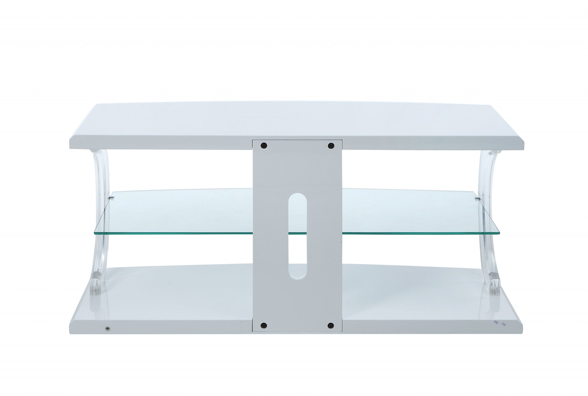 This TV stand comes in a transitional style that will surely be a cynosure of all eyes in the heart of your living room. Wow your guests and family with this stylish piece that features an exquisite white finish table top, glass shelves and a base with modern acrylic posts. Perfectly sculpted from selected wood and veneers and embellished with hand-painted accents in sleek finish. The magnificent piece is equipped with two open shelves for storage spaces and a frame accented by LED lighting. Add class and beauty to your space with this entertainment piece of furniture.