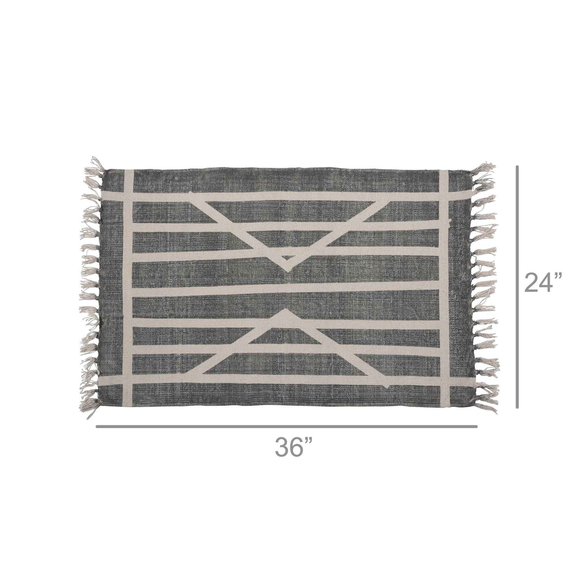 The understated elegance of this Gray and Cream Geometric Scatter Rug will create a harmonious balance of color and contour into your home without competing for attention. Featuring clean lines and geometric shapes in a cloudy cream shade over a distressed pebble gray background for a classy combination to align with the modern interior. The decorative fringes at both ends create an aesthetically pleasing and completed look. This 100% cotton-made rug is printed in the traditional block printing technique and ensures a smooth surface texture that is not only easy to clean but also provides a soft feel under the feet. Made to impress, the neutral hues of this scatter rug will induce a casual elegance into your space. 0.1” x 36” x 24”