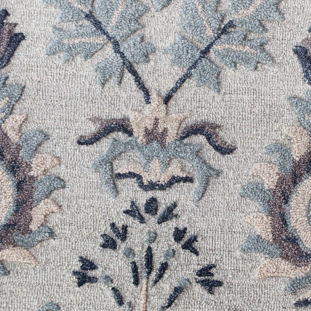 Punctuating an essence of traditional extravagance, this Round Gray Floral Patterns Area Rug will be a stunning addition to any contemporary or traditional living space. The exquisite floral patterns in slate blue, black, and beige create an intriguing piece of art over a dove gray base which is shaped in a semi-circle to fit well in front of a fireplace. Crafted with 100% wool to guarantee strength and sturdiness while being stain-resistant and easy to clean. Made to last long and stand up the elements of high-traffic indoor areas, this rug is constructed with a low pile for a luxurious underfoot. With a sophisticated blend of fashion and function, this area rug will be a worthy addition to your home. 36"