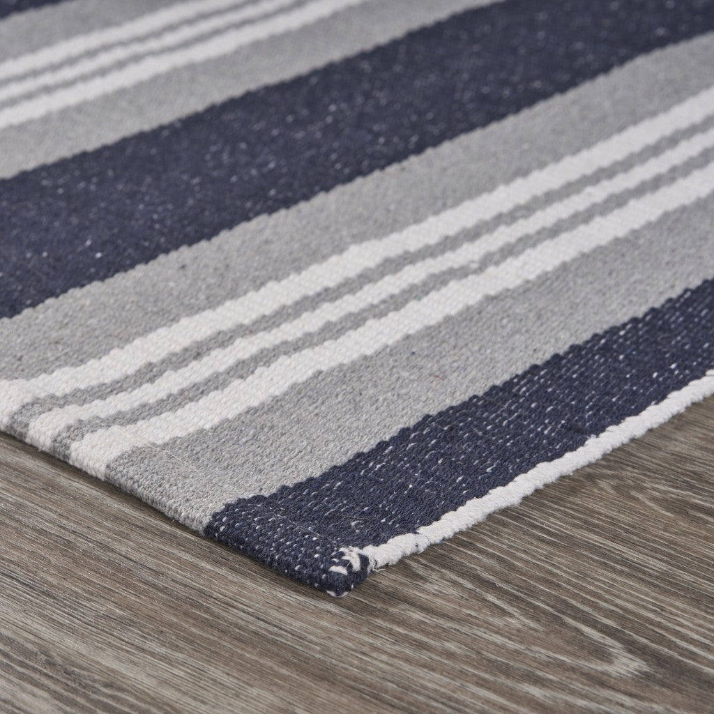 Simple and sophisticated in pattern and palette, this Navy and Ivory Striped Runner Rug will be an ideal accent to your modern home. The irregular stripes overlapping each other in shades of gray and ivory are highlighted on a distressed navy blue background to complement any contemporary, coastal, or nautical styles of decors. With 100% cotton fibers used in its construction, this rug is super soft and strong to stand up to the element of indoor areas while holding dyes for years to come. The medium pile makes it easy to maintain while offering a cozy underfoot with an inviting feel. Flaunting an array of cool-toned stripes with a modern approach, this runner rug will add a sense of style and depth to your home. 30” x 48” x 0.5”