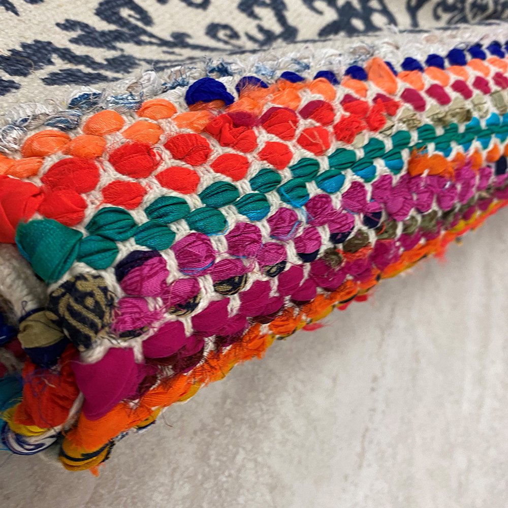 The global styling of this Multicolored Geometric Chindi Area Rug will bring a joyful ambiance into your home with its vibrant color and intriguing patterns. Taking cues from various cultures and tribal patterns, the black and cream segments are accented by multicolored Chindi fabrics to add a playful tone to the piece. Handmade with a blend of cotton and polyester that ensures durability and easy cleaning while holding the color intensity for long. The medium pile construction adds to the surface interest accentuating a soft and cozy feel under the feet every time you step on it, making it a great choice to layer the floor. Introduce this vibrant piece of decor into your living space to add a traditional charm to your home 36” x 60” x 0.5”