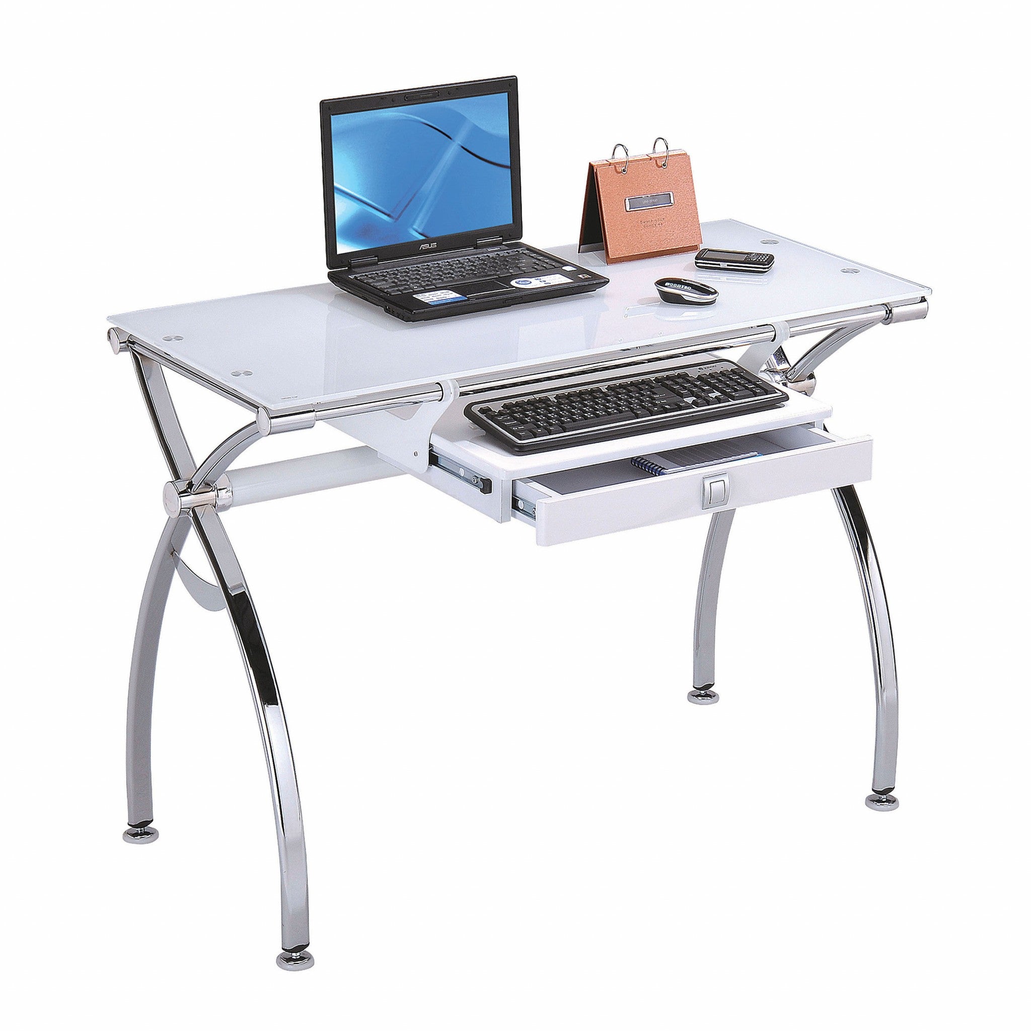 This computer desk offers an sleek and contemporary design. This compact workstation is crafted in silver chrome finish with white Clear Tempered glass top. Features pull-out metal keyboard tray with one storage drawer.