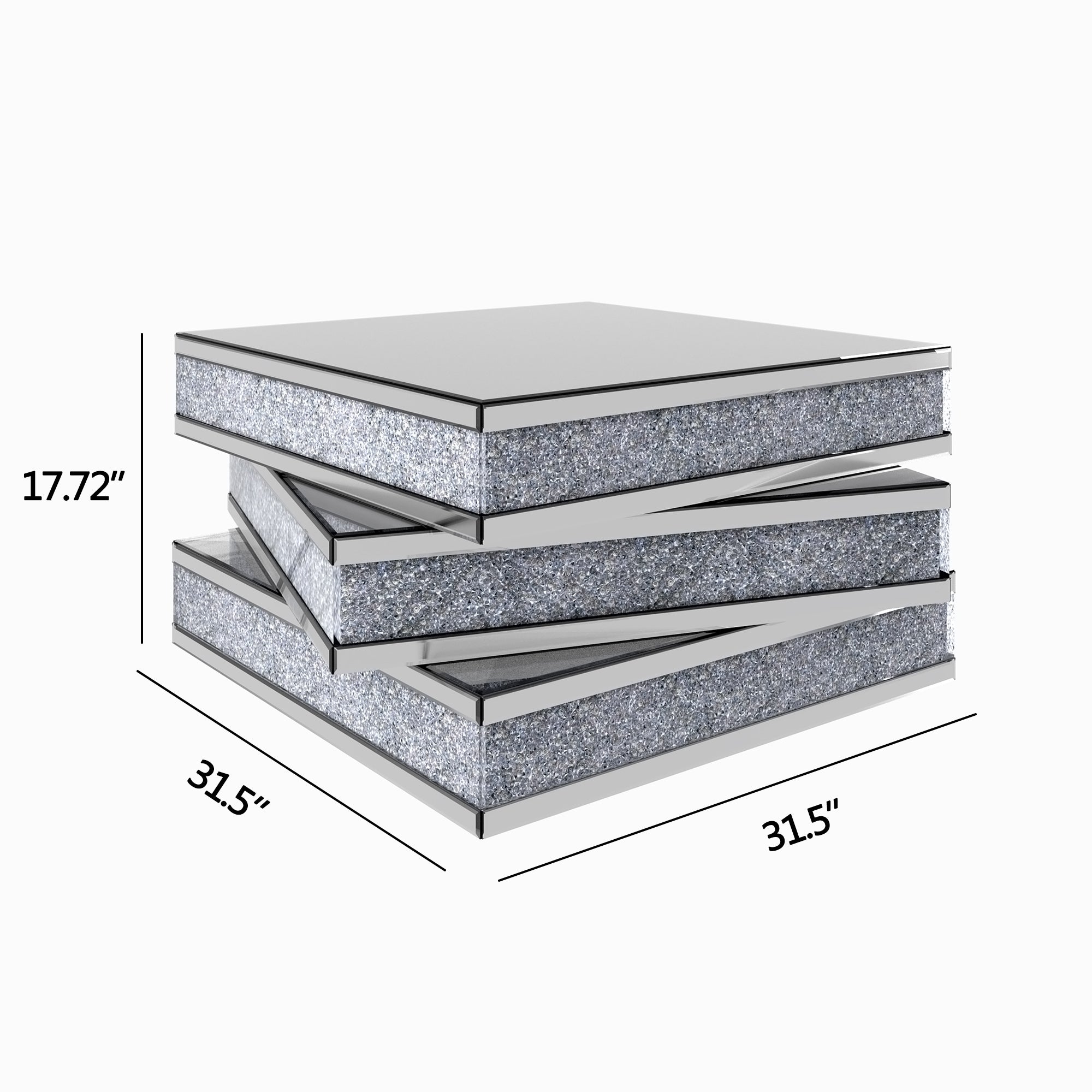Make a striking statement in your space with this Rubik's Bling Silver Mirror and Faux Crystals Coffee Table. This incredibly unique table features three square layers of mirror and inlaid faux crystals that create a geometric twisted design that is fabulous and full of glam. The result is a square top table that will surely be the center of attention. A great way to add brilliance in a modern design that is not only bold and beautiful but fully functional as well. 17.7" x 31.5| x 31.5"