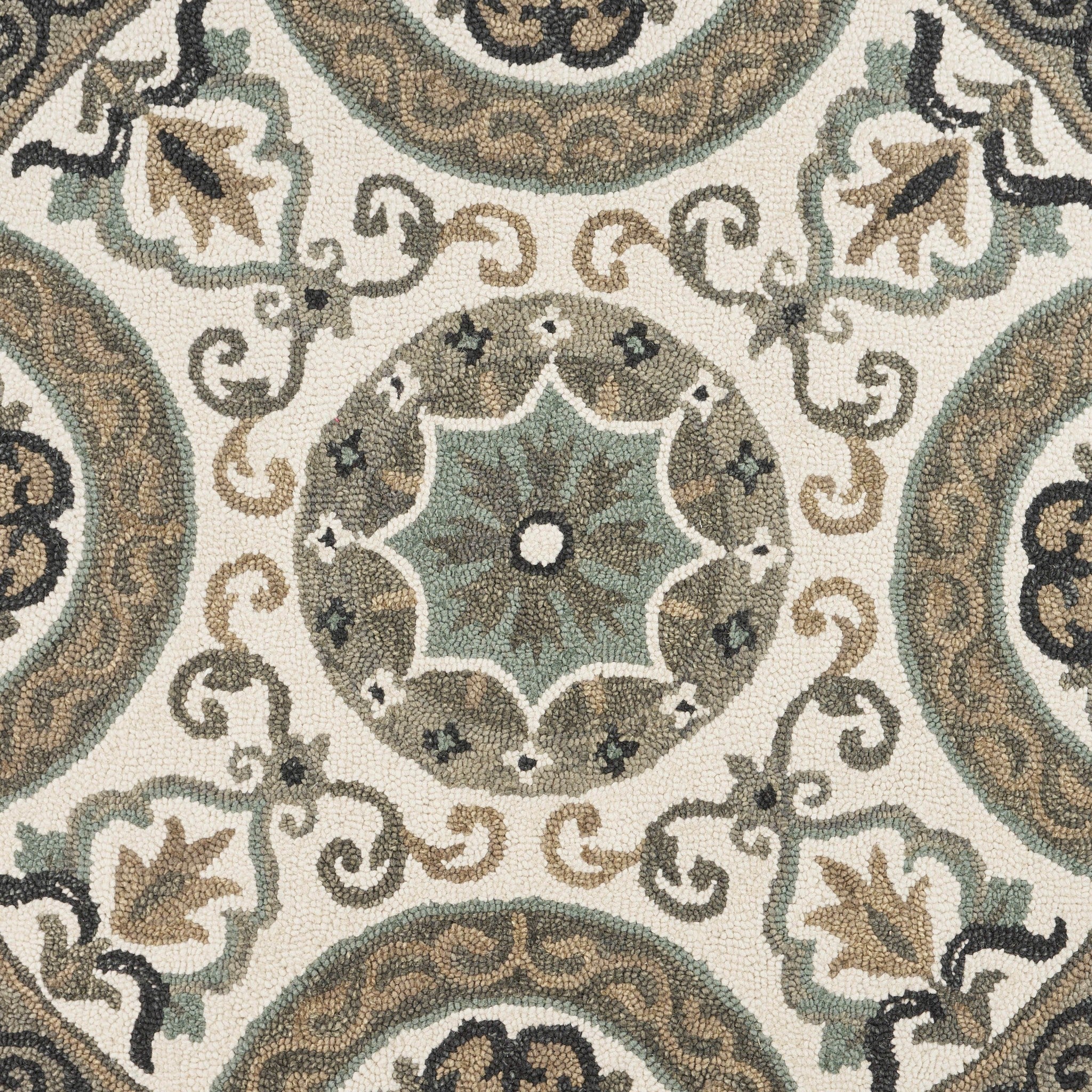 Bring home this exquisite Round Gray Ornate Medallion Area Rug and grace your living space with a combination of class and poise. Brimming with intricately decorative traditional motifs in gray, beige, and black with an ornate border adds to visual intrigue over the white background. This rug is hand-tufted with 100% virgin wool which is easy to care for and would last for decades due to its durability and insulating property, making it a great accent for busy households. The soft pile offers a plush surface texture for a layer of warmth under the feet while keeping dirt and stains away. Flaunting neutrals in a classic refinement makes this alluring area rug a timeless piece to complement any contemporary or conventional setting. 48”