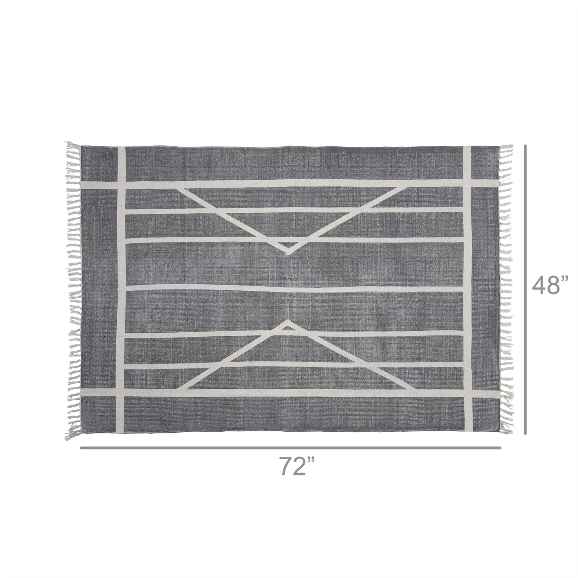 The understated elegance of this Gray and Cream Geometric Area Rug will create a harmonious balance of color and contour into your home without competing for attention. Featuring clean lines and geometric shapes in a cloudy cream shade over a distressed pebble gray background for a classy combination to align with the modern interior. The decorative fringes at both ends create an aesthetically pleasing and completed look. This 100% cotton-made rug is printed in the traditional block printing technique and ensures a smooth surface texture that is not only easy to clean but also provides a soft feel under the feet. Made to impress, the neutral hues of this area rug will induce a casual elegance into your space. 0.1” x 72” x 48”
