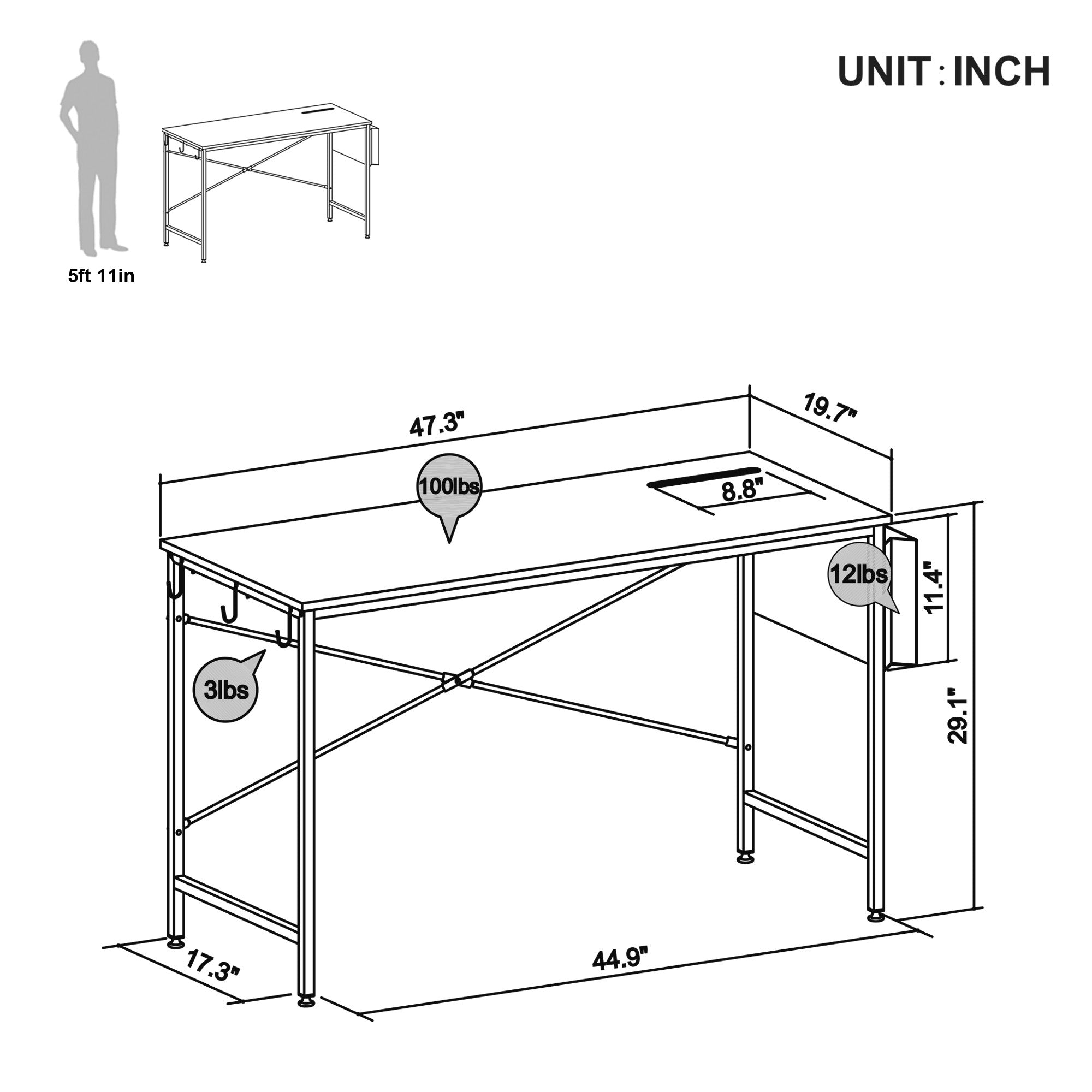 This sleek and simple, Modern Rustic Brown and Black Computer Desk, is a great example of style and function with lots of bells and whistles. In addition to a sturdy construction and a great contemporary design, this desk comes complete with a tablet/phone holder groove on the upper right hand corner, a storage hook, and a fashionable storage back that hangs on the side giving you the opportunity to keep your desk working space neat and clutter free. The tabletop is finished in warm walnut natural wood color that is visually stunning giving the impression of natural grains and imperfections. The heavy duty steel body and back cross bar make this desk sturdy and great desk choice that doesn't take up a-lot of space. Ideal for any room: home office, study area, living room, kids room. 29" x 47" x 20"