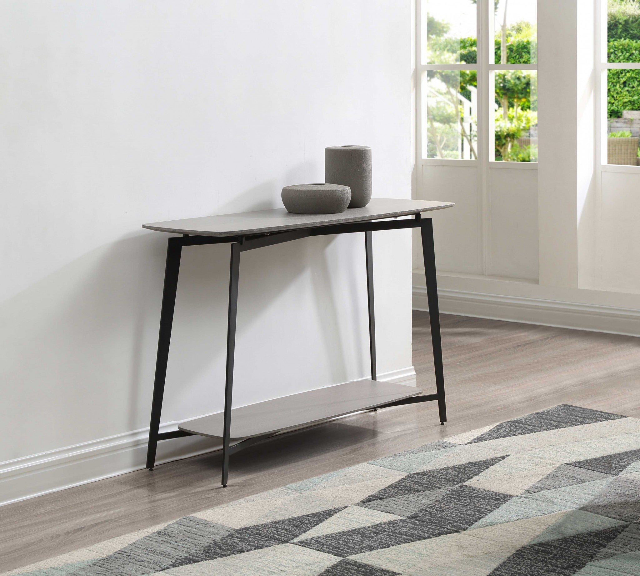 provide your sofa, or love seat, with the best possible companion with this charming console table. this rectangular console table has a classy contemporary style certain to enliven your space, and its grey color and powdered finish will add taste and detail to your living room. this console table is a high quality piece made from high grade oak veneer, and it?s perfect for those who want to bring a bit of life into the ambiance of their place. as for measurements, they are 30? for height, 47? for width, and 16? for depth, and it weighs 60 . the console table can blend in with any decor. it would be ideal for your living room. you can match it with other decorations to get an ideal look for your space.
