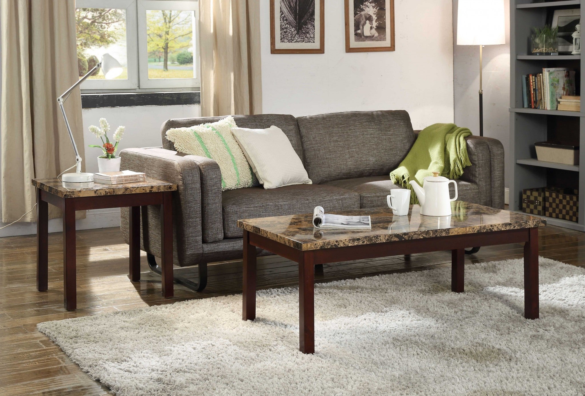 reset the arrangement of your living room with our set of coffee and end table. this set is well thought out and constructed to add class and elegance to any existing home decor. the table surfaces are smoothly finished to exude chic and clean lines that resonate in a modern setting. featuring wooden square legs in cherry finish, this set warms the heart with its complementing faux marble finished table tops. this is definitely a must-have for every home. weight capacity: 50lbs.