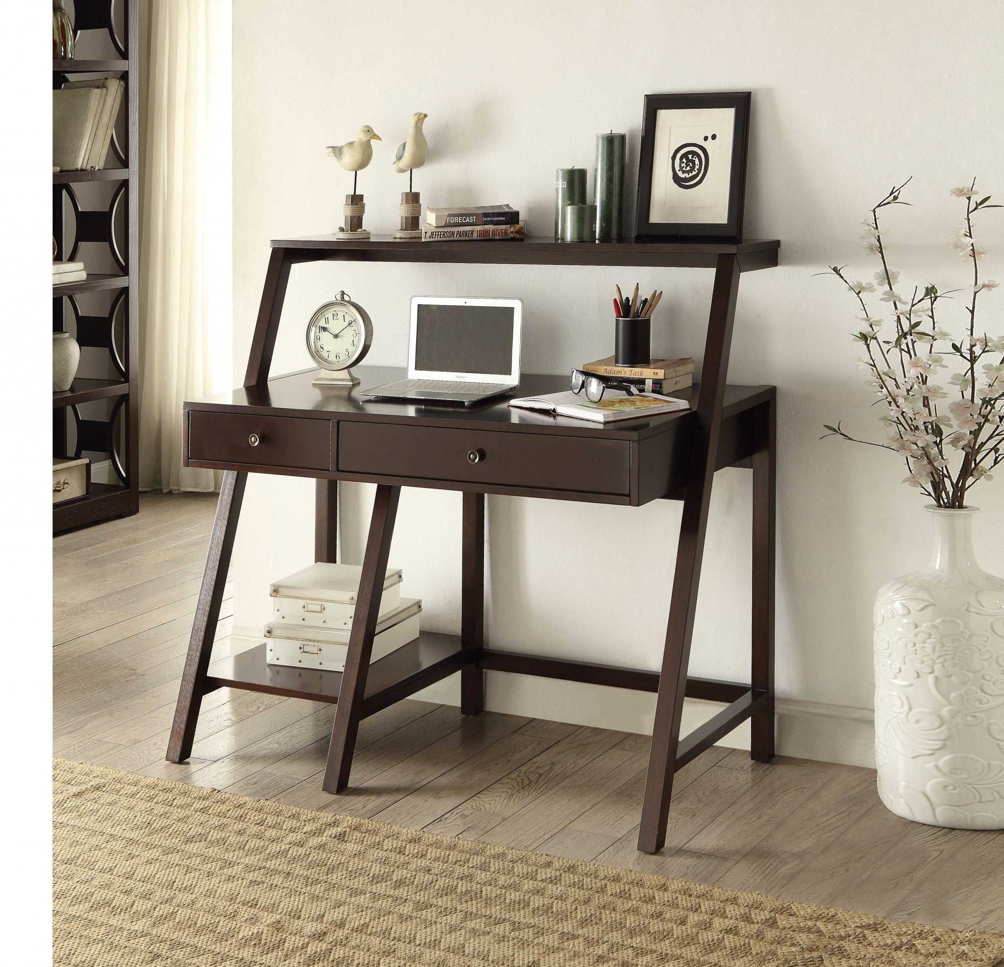 Write in ease and comfort with this rectangular computer desk. The poplar wood finished piece comes in a contemporary style that will seamlessly blend with any home setting. Our writing desk profiles a wooden structure with a trestle base that is completed in espresso. It also features two ample storage drawers and two open shelves for safekeeping a few essentials like books, pens, notepads or keys.