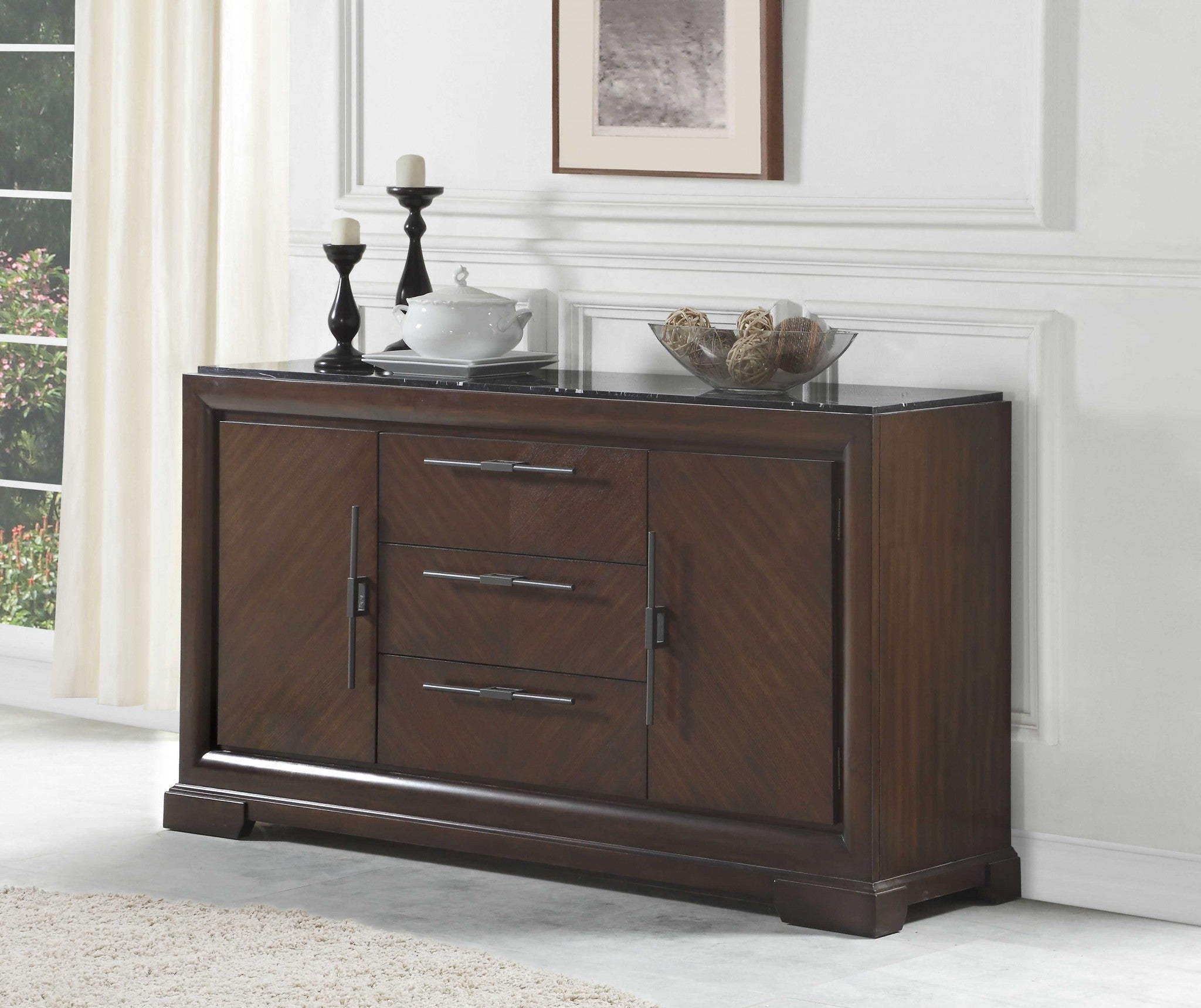 Let this transitional styled server transform the look and ambience of your dining area or kitchen with its scintillating appeal. Finished in marble and tobacco that seamlessly showcase a timeless design meant to be super relevant in any home setting. The intricate construction features three drawers and two front doors for storage, complemented by a marble top. The front profile is outlined by single oversized handles while being anchored by wood bracket legs. Our rectangular server cabinet exudes enduring style that will elevate all your display wares.