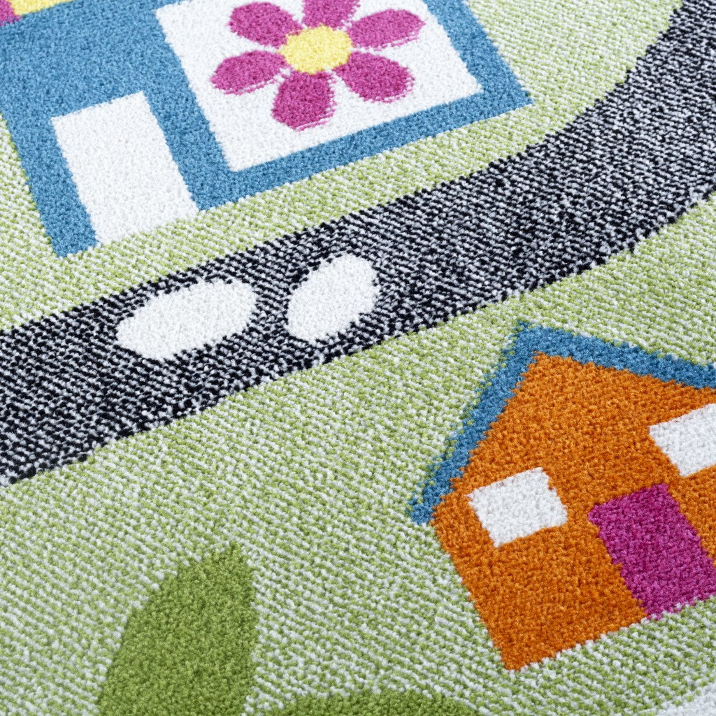 An ideal accent to spruce up your child's room, the beautiful artwork of this Round Green Palace Roadway Area Rug will bring positive and cheerful energy into your home. Showing off a pathway to the magical palace with colorful houses and trees creating a vibrant piece of decor for hours of playtime at home. Made in Turkey with olefin fibers for soft yet sturdy construction that will last for years without staining or fraying. The low pile construction makes it easy to clean and maintain while providing a velvety smooth surface texture to experience a cozy and comfortable underfoot which will be appreciated by both kids and pets alike. The vivid hues and imaginative patterns make this round area rug an ideal accent for a kid's room, daycare, or pediatric office. 56"