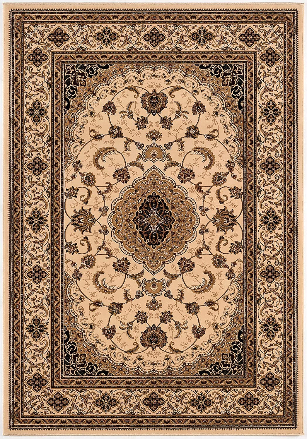 Expressing an aristocratic essence in its design elements, this Round Cream Floral Medallion Area Rug upholds a neutral color palette to blend well in any traditional setting. The Persian-inspired floral vines in shades of tan are highlighted on a cream-toned oblong midsection with an intricately decorative border all around. Balancing between fashion and function, this rug is made in Turkey with 100% olefin heatset fibers to withstand extreme wear and tear of high traffic areas while resisting stains to retain its lustrous sheen for years to come. The smooth and shiny surface texture is due to the low pile construction that offers a soft underfoot, making it an excellent choice for your bedroom, living room, dining area, or hallway. Accentuate a classic edge to your living space with this warm-toned round area rug on the floor. 78"