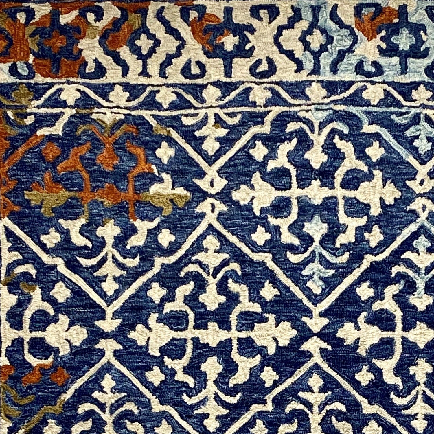 Upholding a rich traditional appeal with an antique touch, this Blue Decorative Lattice Area Rug displays a unique combination of design elements to catch the eye. The intricate detailing of the cream-toned mosaic patterns over a navy blue base creates a striking contrast while the splash of cinnamon brown adds an antique influence to this masterpiece. Hand-tufted with 100% virgin wool that is inherently hard-wearing, moisture-wicking, and insulating to last for years while regulating the temperature in both cold and warm weather. The medium pile construction adds to the surface texture providing a soft and luxurious underfoot for your living room, bedroom, dining space, or entryway. Give your interior a sense of traditional luxury with the rich coloring and visual appeal of this stunning area rug. 84” x 108” x 0.5”