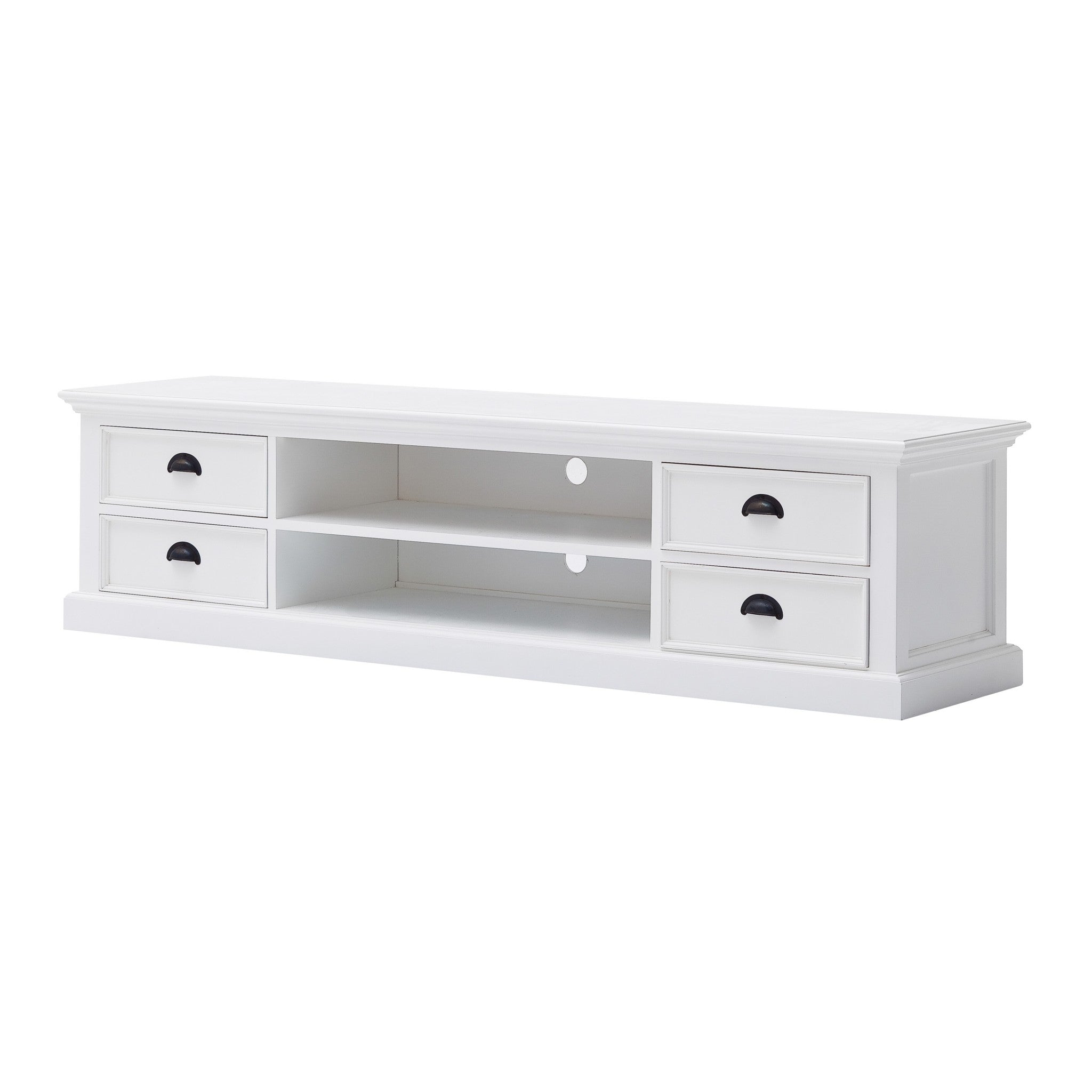 A quinessential innovation, the Classic White Entertainment Unit with Four Drawers is the perfect example of form and function. At just the perfect level and crafted from mahogany wood with a semi-glossy white paint finish the table hits the vintage spot with it's flared crown moldings, moulded plinth base, bevelled drawers and antique brass cup handles. Elegantly equipped with four drawers and shelves, it proivides an adequate amount of space to store all your media components, gadgets and even personal belongings. Cord cut-outs are placed in the open shelf to organize and manage your cords and wires. Owing to it's color, the unit can be easily synchronized with any classic chic or contemporary decor in your home. 17.72" x 70.87"" x 17.72"