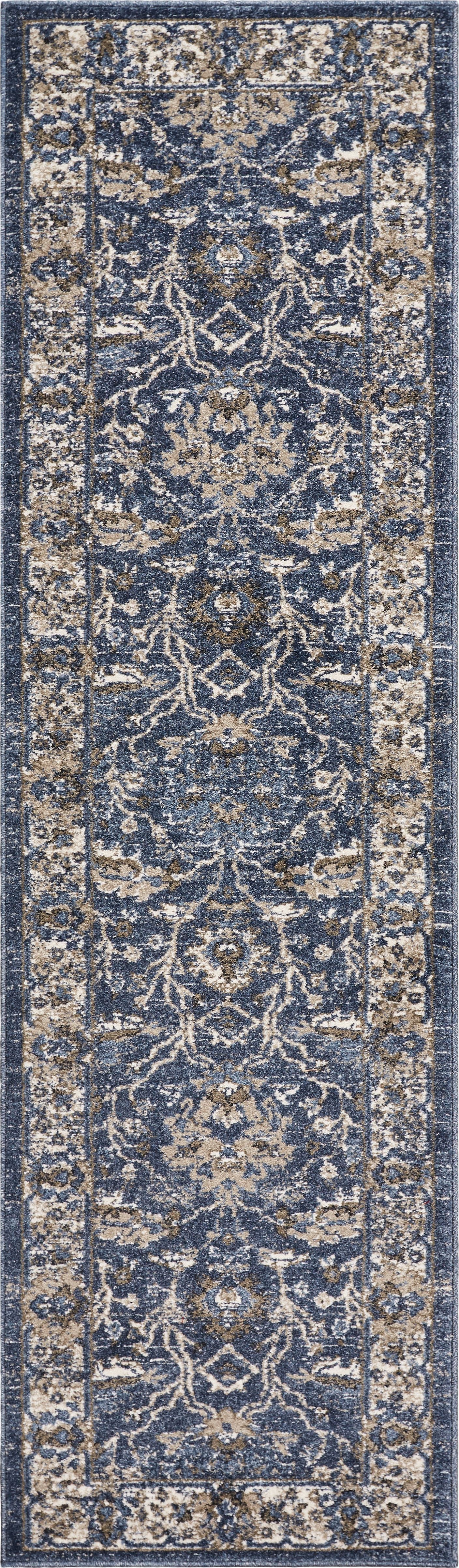 Explore our take on an updated traditional look with our 26" x 90" denim parisian runner rug. Trendy colors against vintage traditional patterns make this rug enticing across all lifestyles and generations. Machine-woven in Turkey of 100 percent heat-set polypropylene frisee yarn with no backing. This brings a plush pile of 1/2" to your floors. Vacuum regularly and spot clean stains. Professional cleaning recommended periodically.