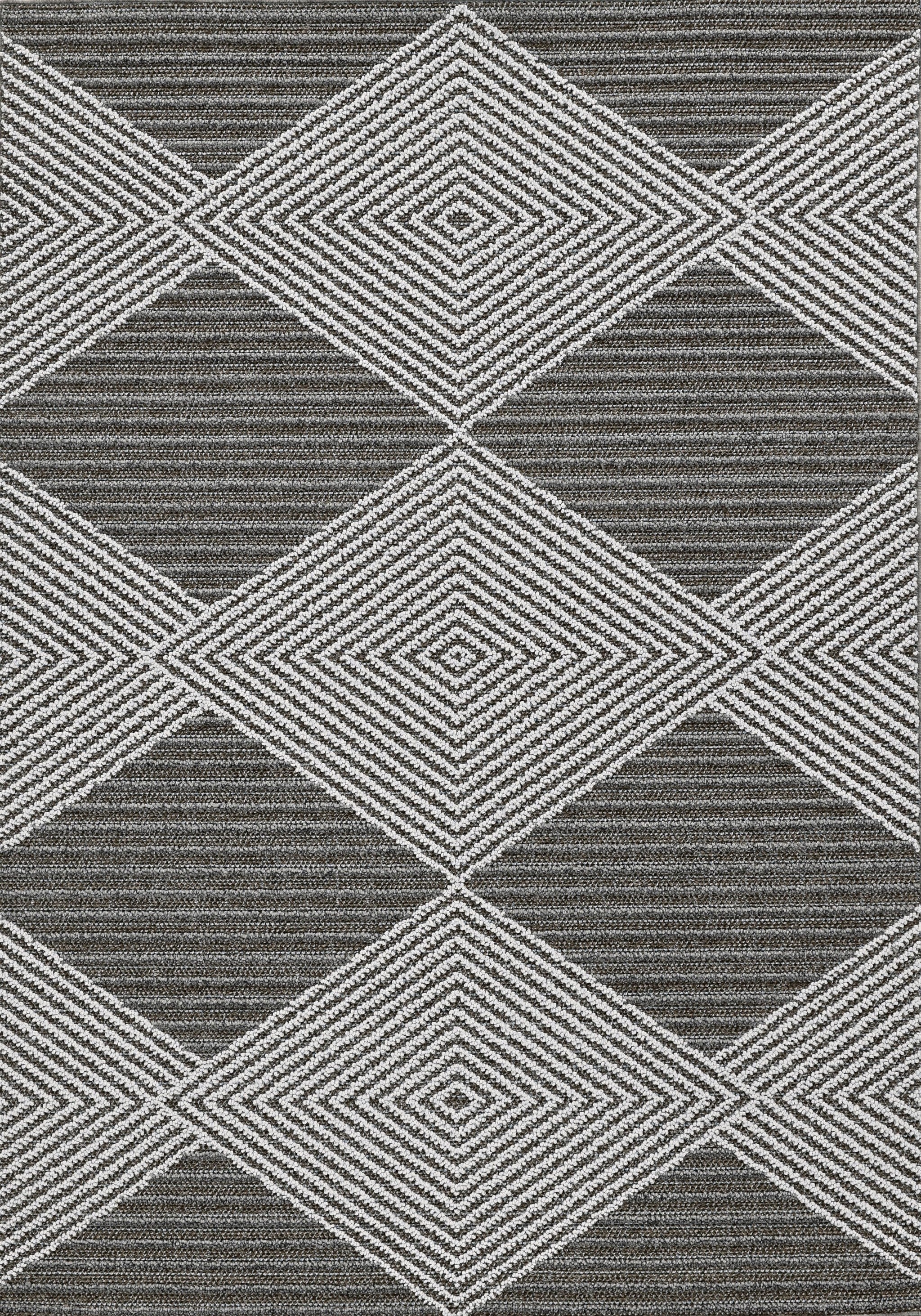 Refresh your outdoor living space with one of our transitional rugs. This rug is easy to decorate with, easy to clean, and easy to love? These rugs will rejuvenate any living space whether indoors or out. This is machine woven in Turkey of UV-treated polypropylene with texture and has a low pile height of 1/4". This 31'' x 93" grey/ivory diamonds runner is machine-woven of UV-treated polypropylene with no backing. Vacuum with floor attachment if needed. Blot spills immediately. Spot clean stains with mild detergent and white cloth. If used outdoors, rug can be hosed off and dried on a flat surface.