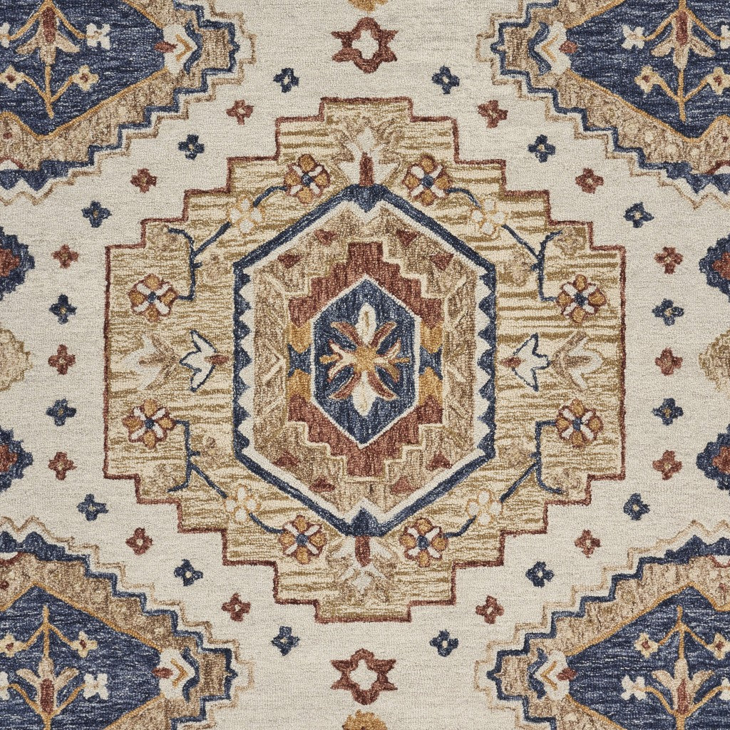 Embrace an essence of bohemian styling with this Round Gold and Blue Boho Chic Area Rug that features a classic color palette with bold and beautiful patterns. The intricate geometric detailing In gold and navy with a stunning center medallion looks impressive while the decorative border adds to the charm. Made with 100% wool, this rug is soft yet durable enough to last long and retain its color intensity for long. The low pile adds to the surface texture for a smooth and sumptuous underfoot, making it a luxurious accent on the floor. Roll this alluring round area rug on the floor and accentuate a boho-chic vibe into your place. 93”