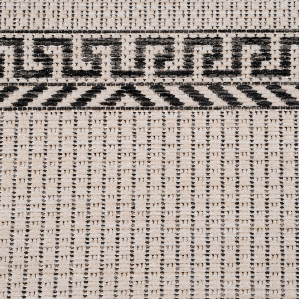 Representing the ultimate form of simplicity and sophistication, this Cream Double Border Indoor Outdoor Area Rug will be a timeless addition to any modern or traditional home. The precisely gridded cream-toned base is framed with double Greek key patterned borders in charcoal black to accentuate the splendor of this piece. Skilfully crafted by Turkish artisans with the finest blend of polypropylene and polyester to ensure color intensity, stain resistance, and durability to last long for years without losing its shape and shine. Made to work well amidst high-traffic areas indoors and out, this rug is constructed with a low pile for a smooth and sturdy surface texture that is not only easy to clean but also luxurious on the touch. Perfectly balanced with a neutral palette, this area rug is a practical solution to enhance the aesthetics of your home. 90” x 113" x 0.35"
