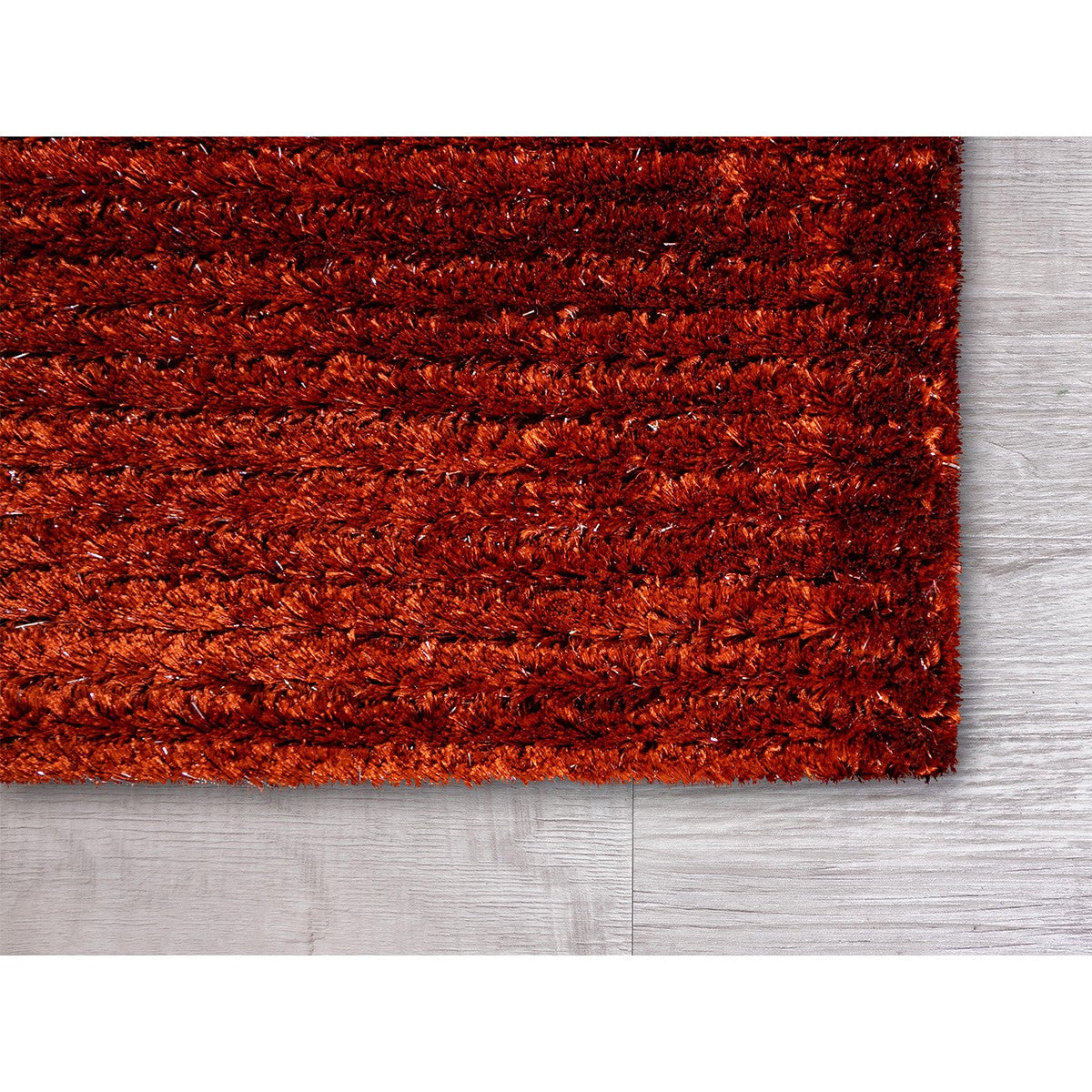 Emphasizing modern sophistication with hints of bohemian flair, this Flame Red Modern Shimmery Area Rug showcases an exemplary fusion of charm and simplicity. The flame-red undertone of the twisted fibers is highlighted with metallic accents in a thin striped silhouette for a glamorous look. Crafted with care from high-quality polyester that's known for its strength and durability to last for a long time while resisting stains from typical spillage to keep its shape and shine for years to come. The dense and plush pile construction adds to the surface texture and provides a luxurious underfoot for warmth and coziness, making it an excellent pick for indoor areas with moderate foot traffic. The vibrant hue and sturdy construction of this area rug will enhance the beauty of your interior décor and anchor your living room with an energetic vibe. 120” x 96” x 0.5”