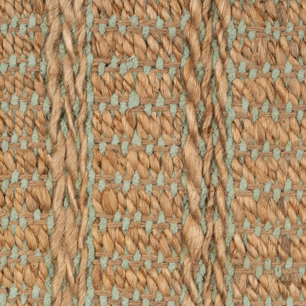 Embrace the earthy essence of this Tan and Seafoam Braided Area Rug that will give your living space a modern touch with a bohemian vibe. Combining two soft shades of sage and tan with braided details creating a subtle undertone for visual interest. Standing the test of quality and comfort, this rug is made of jute and chenille mix for optimum durability against the wear and tear of indoor areas while offering a luxuriously soft surface texture for a layer of warmth under the feet. The low pile construction makes it easy to clean and maintain while preventing dirt and grime from getting stuck in it. Set an inviting and calming tone into your home with this classy area rug rolled on the floor. 108” x 114” x 0.4”