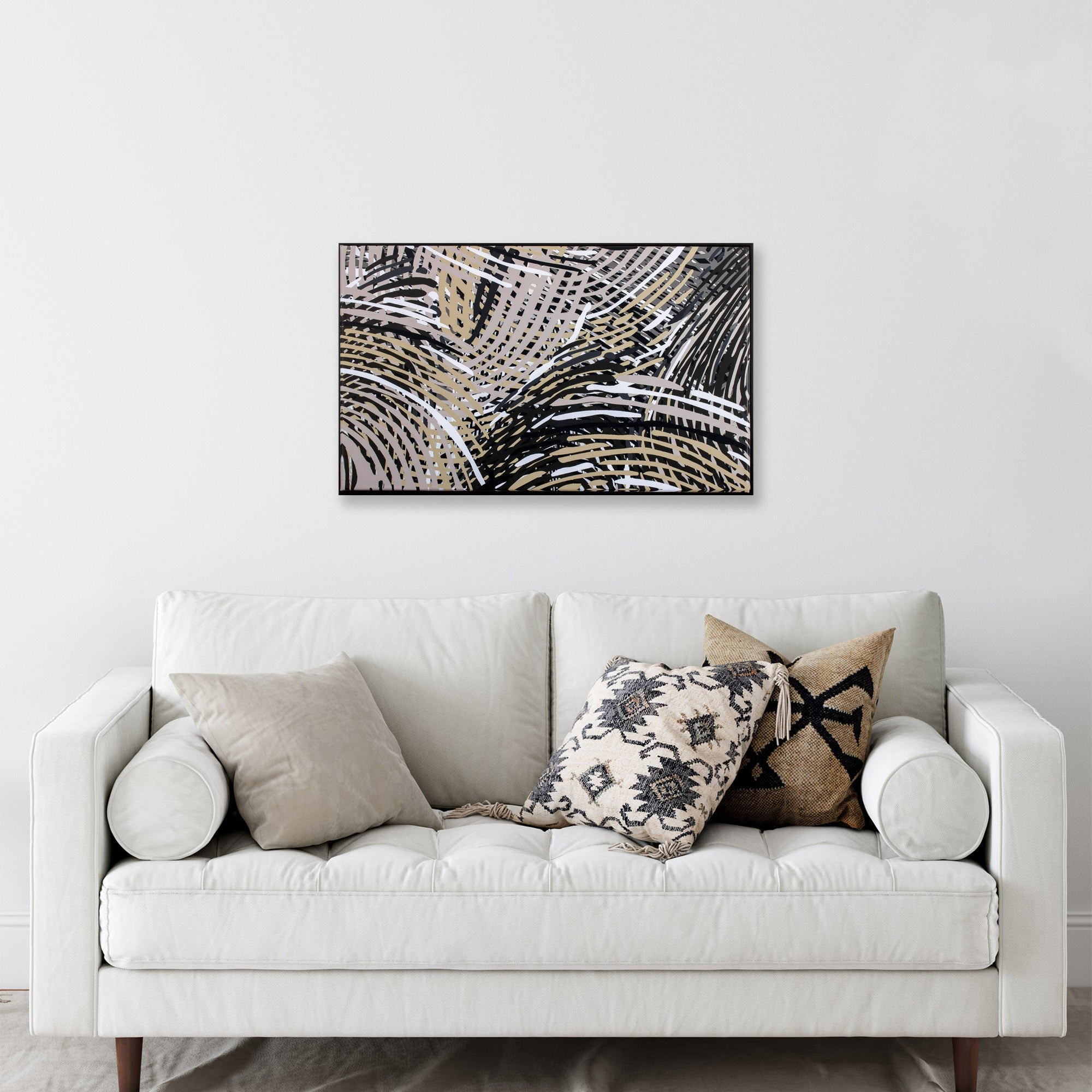 Modern and unique, this Abstract Fingerprint Pattern 1 Wall Art will liven up your space. This rectangle canvas features beautiful colors strokes of neutral colors. This canvas is framed with distressed dark wood moulding. Add this print for a contemporary unique look to your living room, bedroom, entranceway, or office. 35" x 21" x 2".