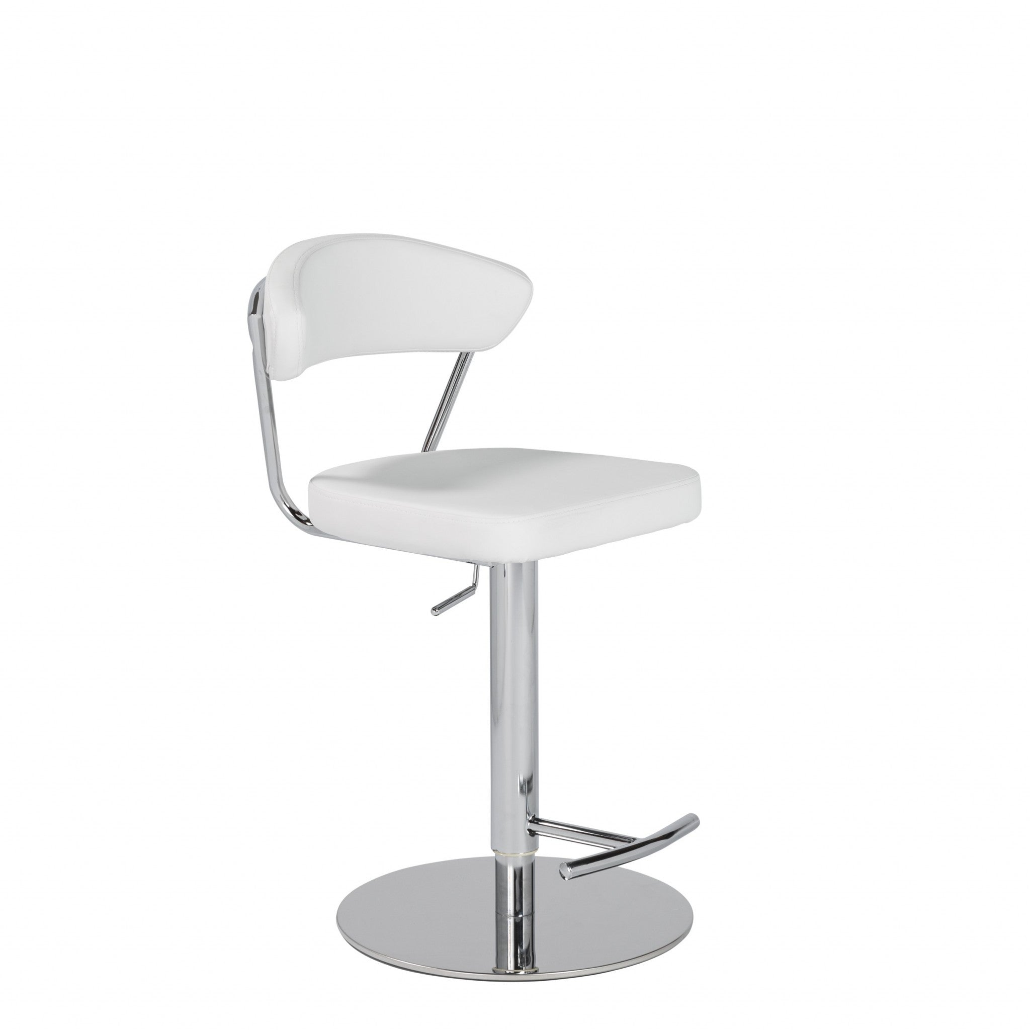 With this Adjustable Swivel White Aluminum Stool you can add design and extra seating to any dining space in your home. The base of this stool is made from aluminum with a shiny silver finish. The stabilizing base has a round shape and there is a footrest attached for comfort. The seat is covered in a soft white faux leather and has rounded corners and a unique flaired and curved back giving this stool a contemporary style. The best part about this stool is that it is adjustable which means great as a bar stool or counter stool and has swivel action for complete and convenient use. 42.13" H x 19.3" W x 19.69" D