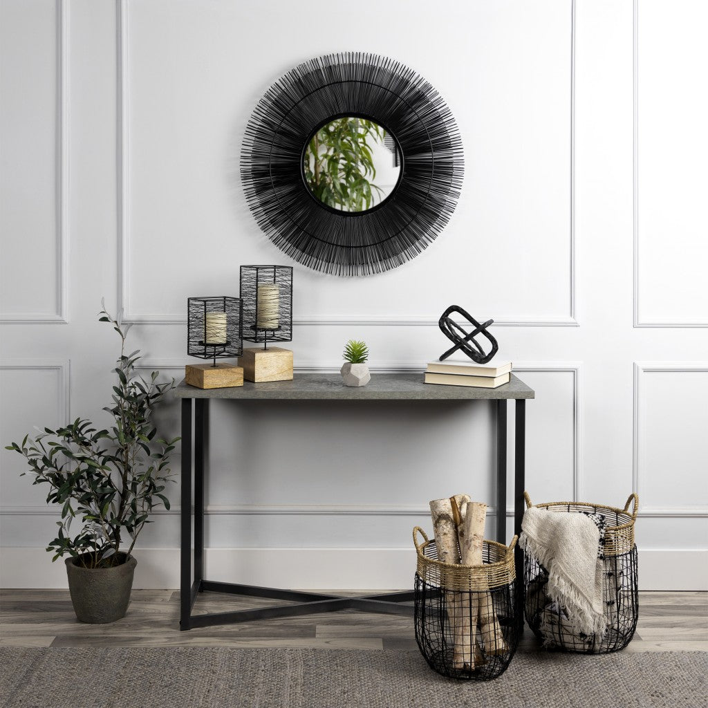 With this Black Iron Sunburst Wall Mirror you can add a touch of modern design to any space in your home. The mirror inside has a round shape and is bordered by a thin black iron border. From this border There are two layers of thin rods coming out and creating a multi-layer sunburst pattern. There is one circular bracket in the middle of this pattern for added depth and texture. This mirror can be used as a decorative mirror in any room, or you can use it to open up a smaller room and make it look more open and brighter. 2" H x 30.25" W x 30.25" D