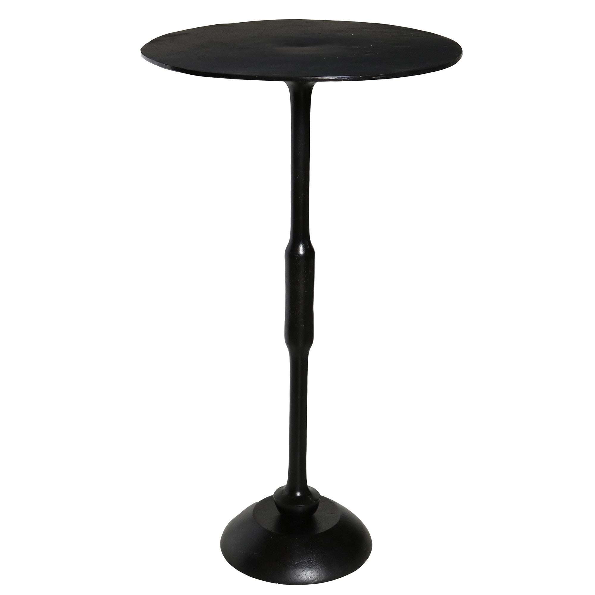 With this Black Metal Side Table you can add a touch of contemporary design to any room in your home. This table is made from solid metal and has a black finish on top. The base of this end table has a domed shape out of which there comes a metal rod with a thicker middle belly. This metal rod hold the small circular table top in place. This minimal piece will look great in any room owing to its neutral colorway and simple design. You can use it as stand-alone piece or it can serve as an end table in your living room. You can also use it as an entryway table to hold your keys. 25" H x 14" W x 14" D