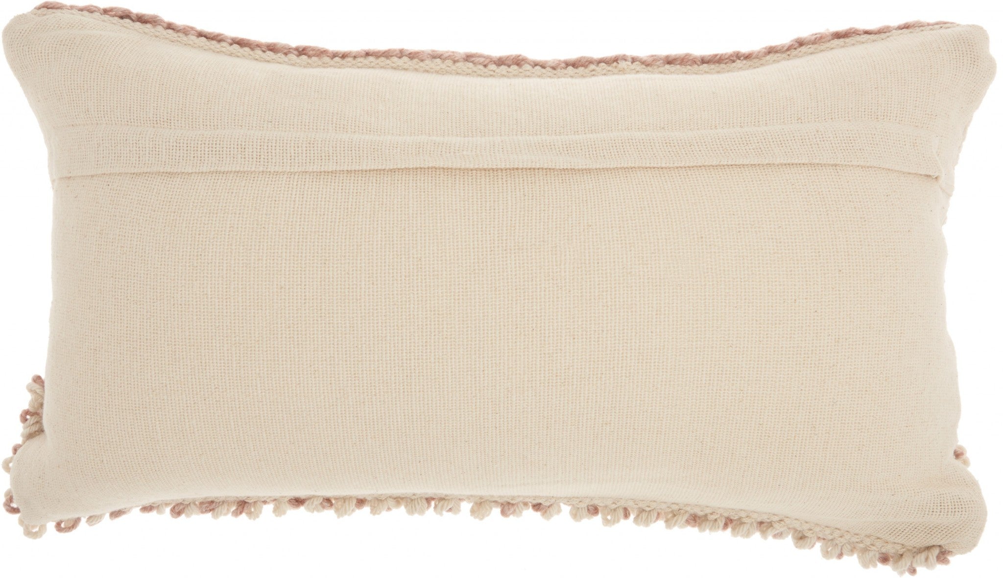 With this Bohemian Pink and White Lumbar Pillow you can add the perfect touch of design and comfort to your couch. This pillow has a rectangular shape and is covered in a macramé fabric that gives it a soft and textured look. The fabric has a pink and white colorway which means it will work with any existing colors or decor style you may have in your home. There is a geometric block pattern on the top half of this cover while the bottom has a dashed design. The bottom edge has small thread tassels in the same pink and white colorway and finishes the look of this pillow perfectly. Use this lumbar pillow on your couch, on your bed, or on any chair to elevate the look. 5" H x 14" W x 24" D