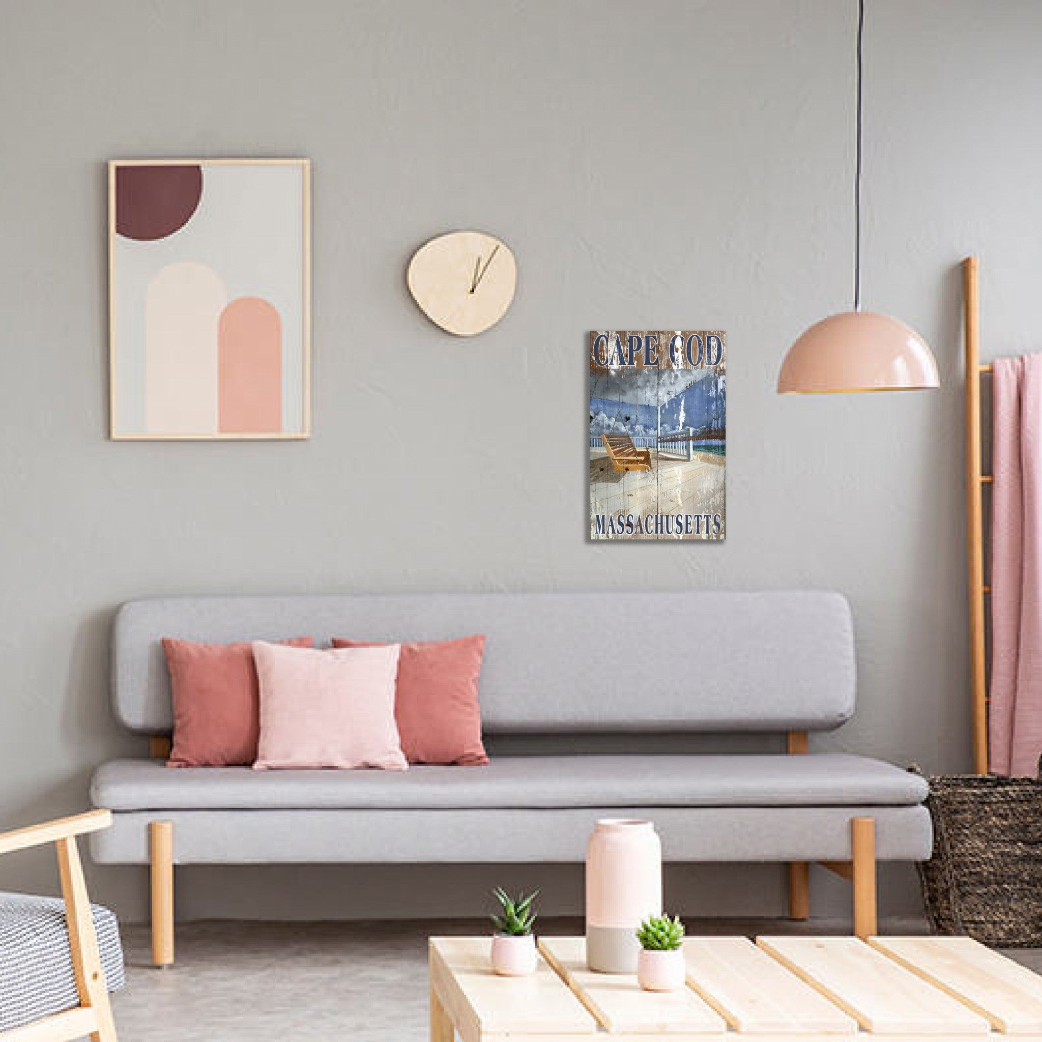 Rustic and imperfect by design, this Cape Cod Porch Swing Wall Art is a unique and colorful way to bring some vintage Cape Cod Massachusetts memorabilia to your space. This casual, piece of art is printed directly onto genuine distressed wood planks with knots and grains that give it an authentic vintage look and feel. This vintage wall art is a unique addition to any beach house, living room, office, or bedroom. 15" x 26" x 2".
