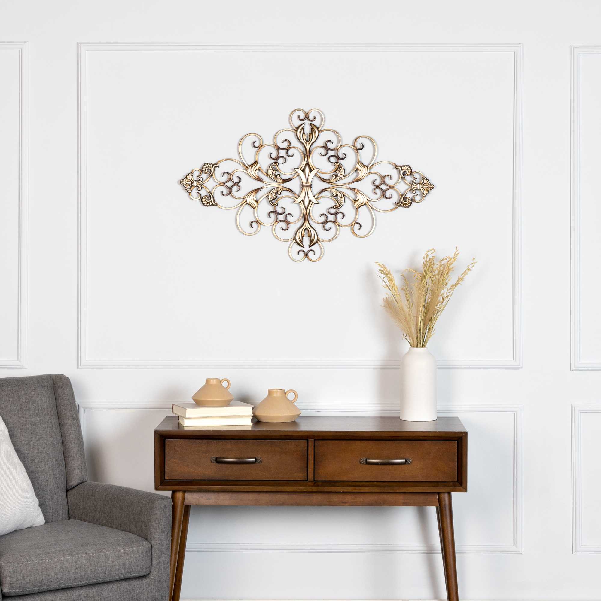 This decorative wall scroll is all about uplifting the look of your home with its elegant filigree details. The frame is made of solid metal that won't warp or get deformed. The whole piece radiates with a stunning champagne color and finish.