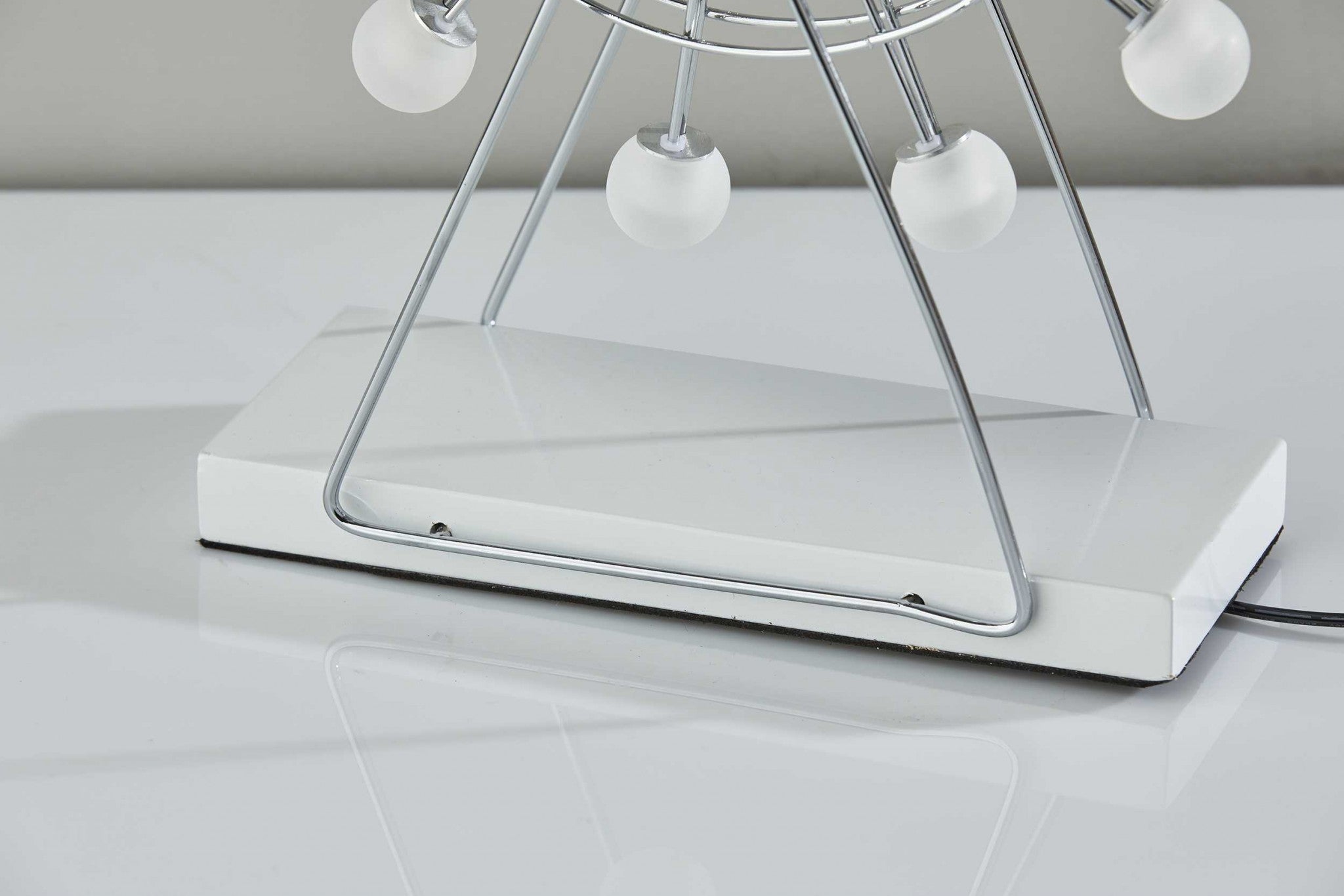 This small LED Ferris wheel table lamp is a whimsical accent for your home and an efficient source of ambient lighting. The .5W integrated LED frosted acrylic globe shades provide a warm glow and spin just like a real Ferris wheel. The small size is 15.25" high & 12 "wide with 12 globe shades. Perfect for a kids room or to add a fun accent to a bookshelf or living space!