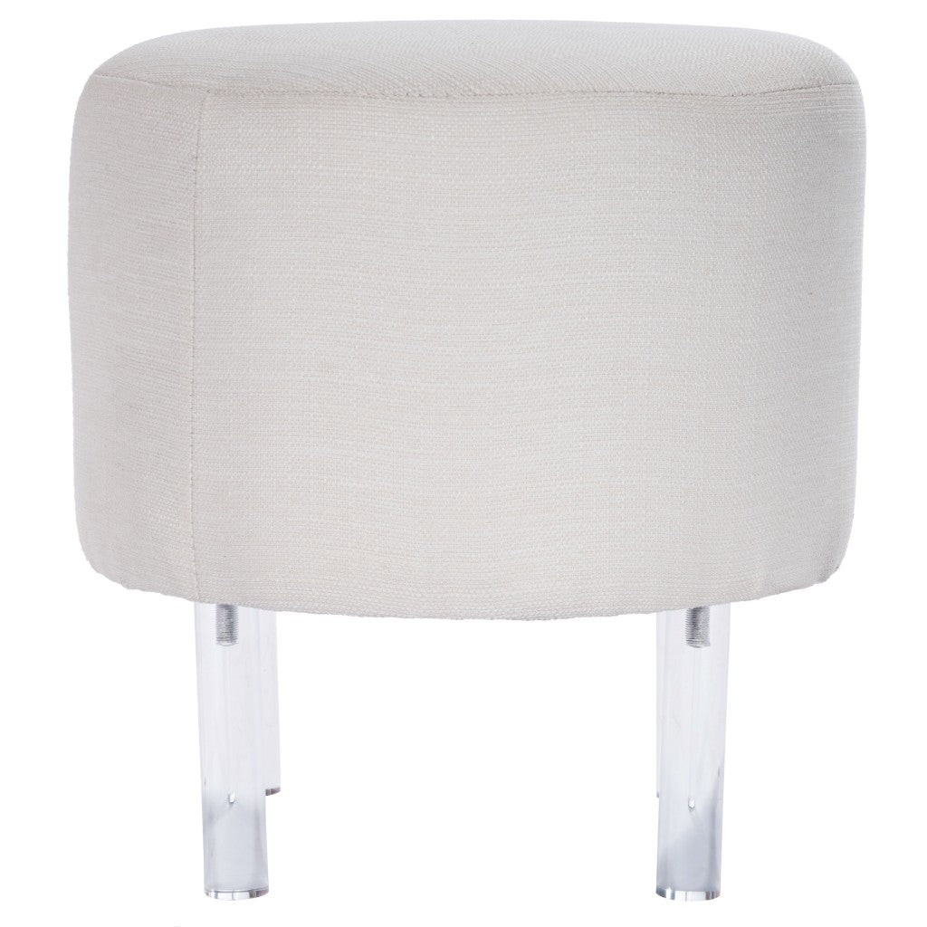 Add a modern touch to any room with this Contempo Chic White Round Ottoman. This ottoman/footstool features a tastefully fashionable white linen upholstery and sits atop clear acrylic legs that give it a unique touch. Super soft and padded, this ottoman is ready to support your feet up in comfort. Can also be used as an extra seat if needed and would work most anywhere from a living room, office, to the bedroom or vanity. 18" X 17" X 17"