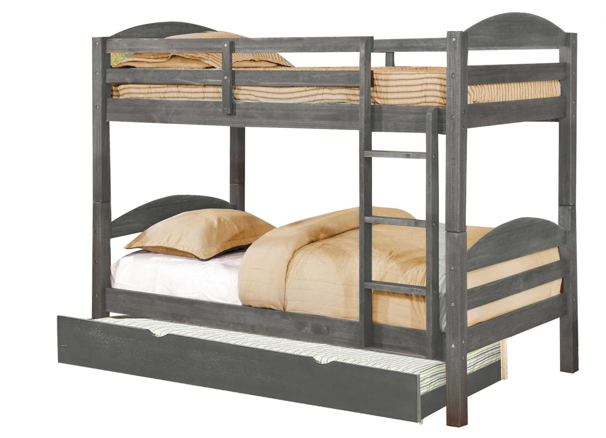 Utilize the space and add some fun and interest with this sturdy and good looking classic bunk bed. It consists of two twin beds, which can used as standalone units, and a twin pull out trundle for underneath the bottom bunk. A sturdy wood ladder is available to take you up and down without stress. There are also safety rails on the top bed for safety plus beautiful headboard and footboard on both beds. This bed combines both style and functionality into one piece, add it to your guest room or kiddies room for cozy sleeping hours. Its natural washed gray finish adds a lovely twist to any decor. Dimensions: 81.25" X 42.5" X 62.5".