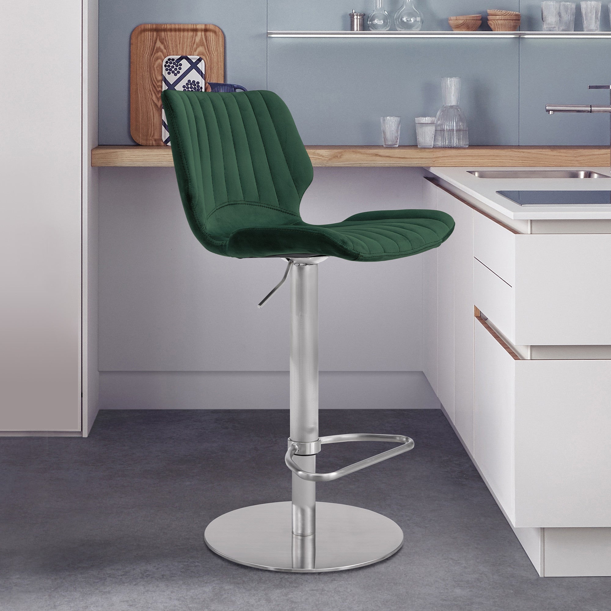 Flaunt your taste in modern designs and styles with this Deep Green Velvet and Chrome Channel Stitch Adjustable Swivel Bar Stool. The modern armless velvet chair features vibrant color and channel tufted stitching on the seat and backrest that pairs perfectly with the stainless steel pedestal base and footrest. Every element of this stool combines well to add a touch of class to your home bar, kitchen counter, or wherever you decide to place it. Enjoy comfort in the most exciting way with the stool's 360-degree swivel function. 42" x 18" x 20"