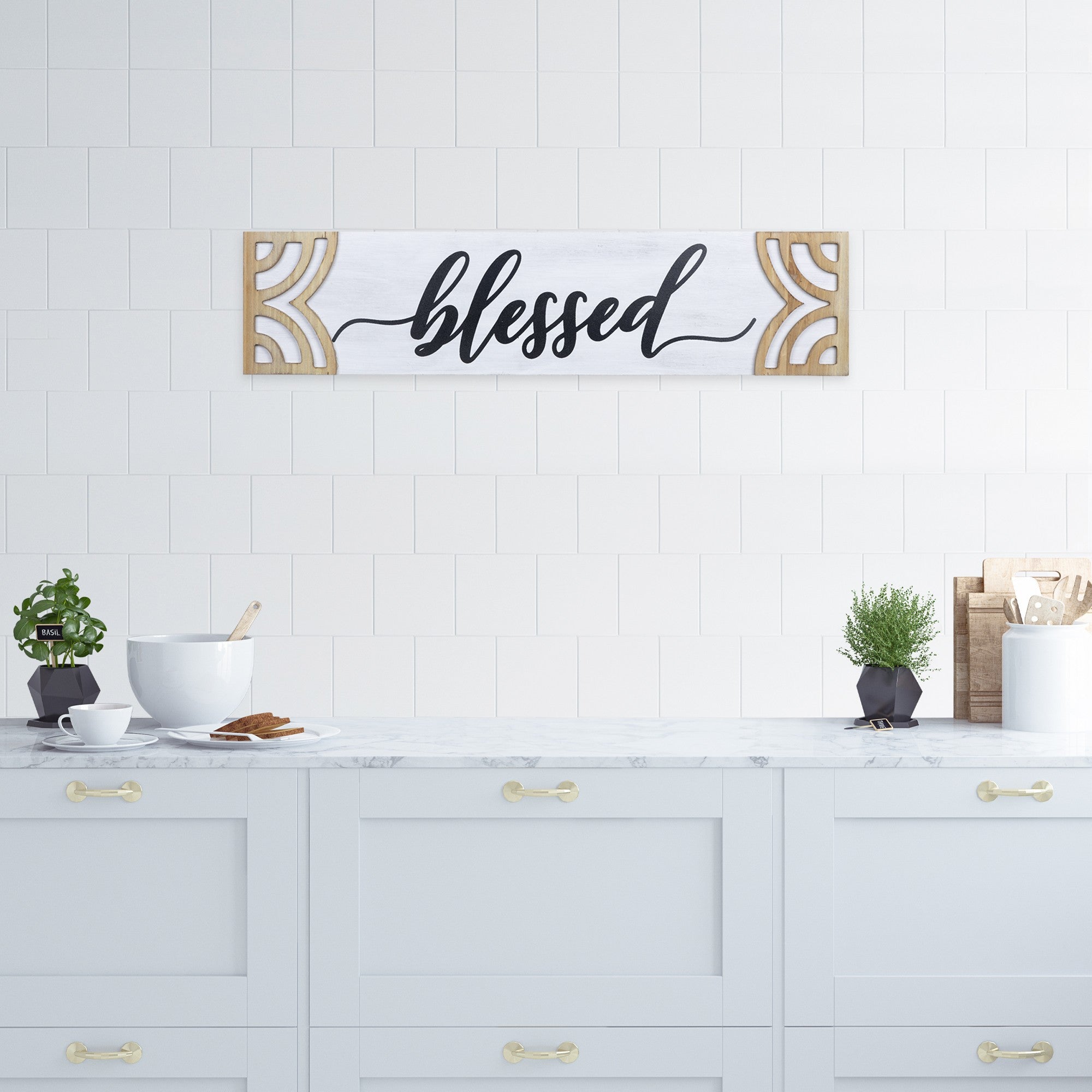 Add the perfect touch of gratitude and design to your home with this Farmhouse Style Blessed Wall Plaque. This frame of the plaque is made from solid wood which makes it sturdy and durable enough to be used indoors and outdoors easily. The frame is finished with a light brown varnish and has detailing on it. The frame only covers the side edges of the piece. Inside the frame there is a white wooden plate that has the words 'Blessed' written on it. You can use this in your home anywhere as the neutral colorway will work with any interior style. 4.75" H x 20" W x 0.62" D