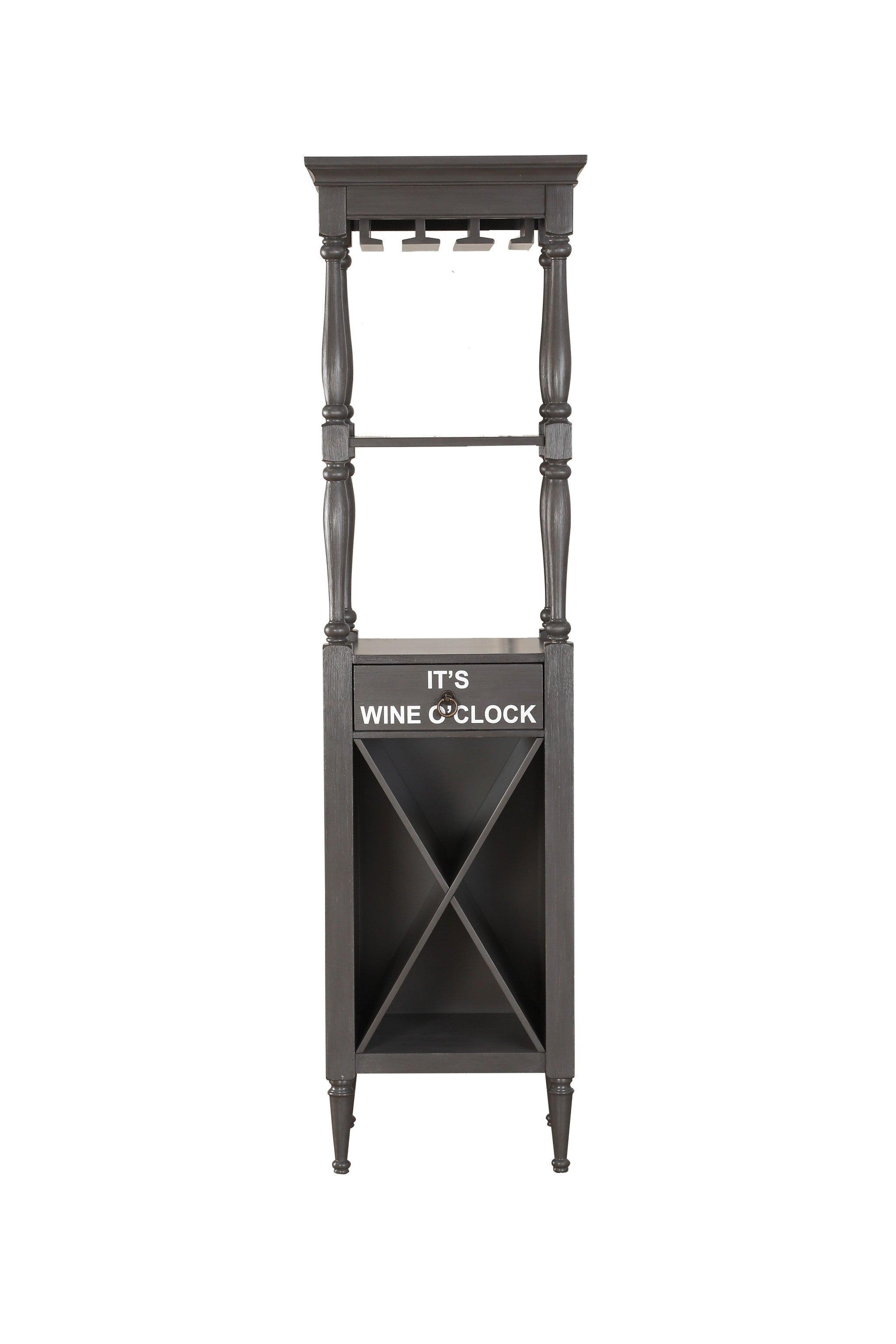 This Fun Wine Antique Gray Wine Bar Cabinet is a stylish and convenient addition to any bar or lounge area. This tall wine cabinet is a must-have structure to keep drinks and glassware within easy reach. Emblazoned with fun sayings like "Wine and Friends are Always a Great Blend" and "It's Wine-O-Clock" this rustic finish vintage style cabinet is a fashionable, fun, and decorative way to store some of your favorite bottles of vino. The decorative carved designs along the upper area offer a peek at your treasures while a center drawer and lower wine racks provide safe haven for smaller and more delicate items. 73" x 20" x 18"