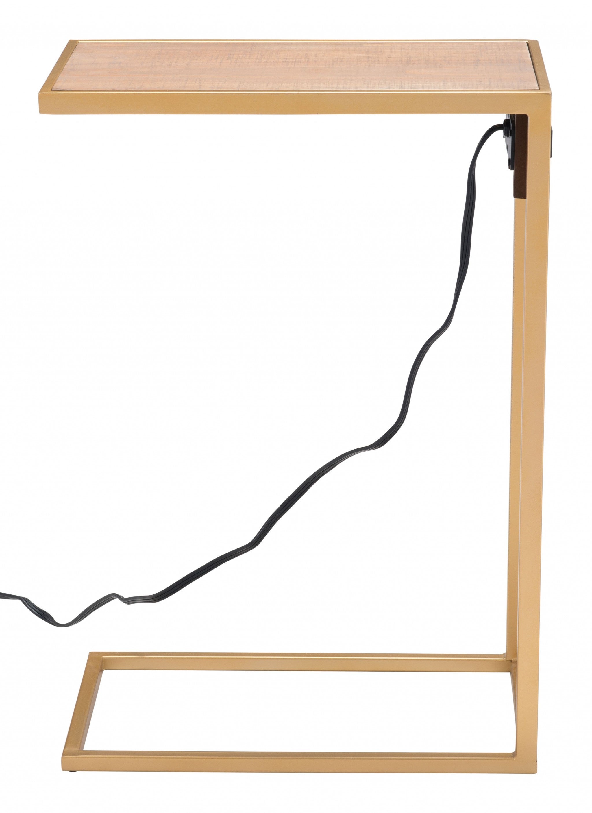 Make your life easier while adding style to your home with this Gold and Brown Sliding Side Table. The frame of this table is made from steel and is colored to a shiny gold finish. The frame has a vertical bench shape with a rectangular top and bottom and a side plank attaching both to each other. The table top is made from solid wood and is colored to a light brown finish. Behind the table top there is a panel which has electrical sockets in it. This table is utility and design in one and you can move it around easily. 26" H x 18.1" W x 10" D