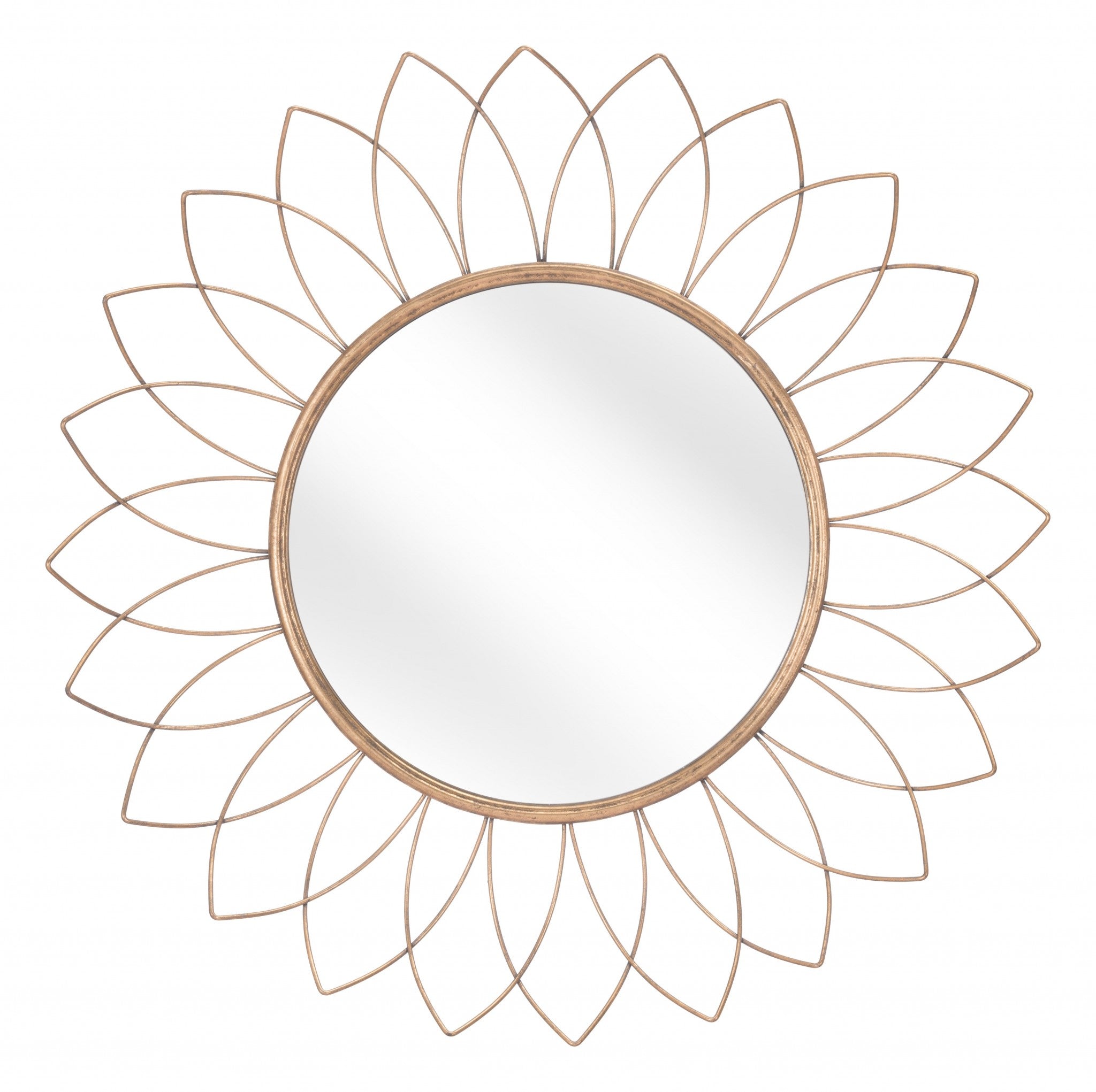 Add a touch of floral elegance to your home with this gold flowerburst round mirror. The flowerburst frame is made from stainless steel and features a gold petal design arranged in different rows to add depth and dimension to the piece. In the middle of the frame there is a round mirror which is bordered by a solid gold circle. Light bounces off of the gold petals beautifully and makes your room appear brighter and much larger. This mirror is sturdy yet light enough to hang anywhere is your home. A hardware kit is included in the package to help you hang the mirror up. Add a decorative element to your own home or gift this flowerburst mirror to your friends and family. Product 31.5" H x 31.5" W x 3.1" D. Mirror 28" H x 16" W