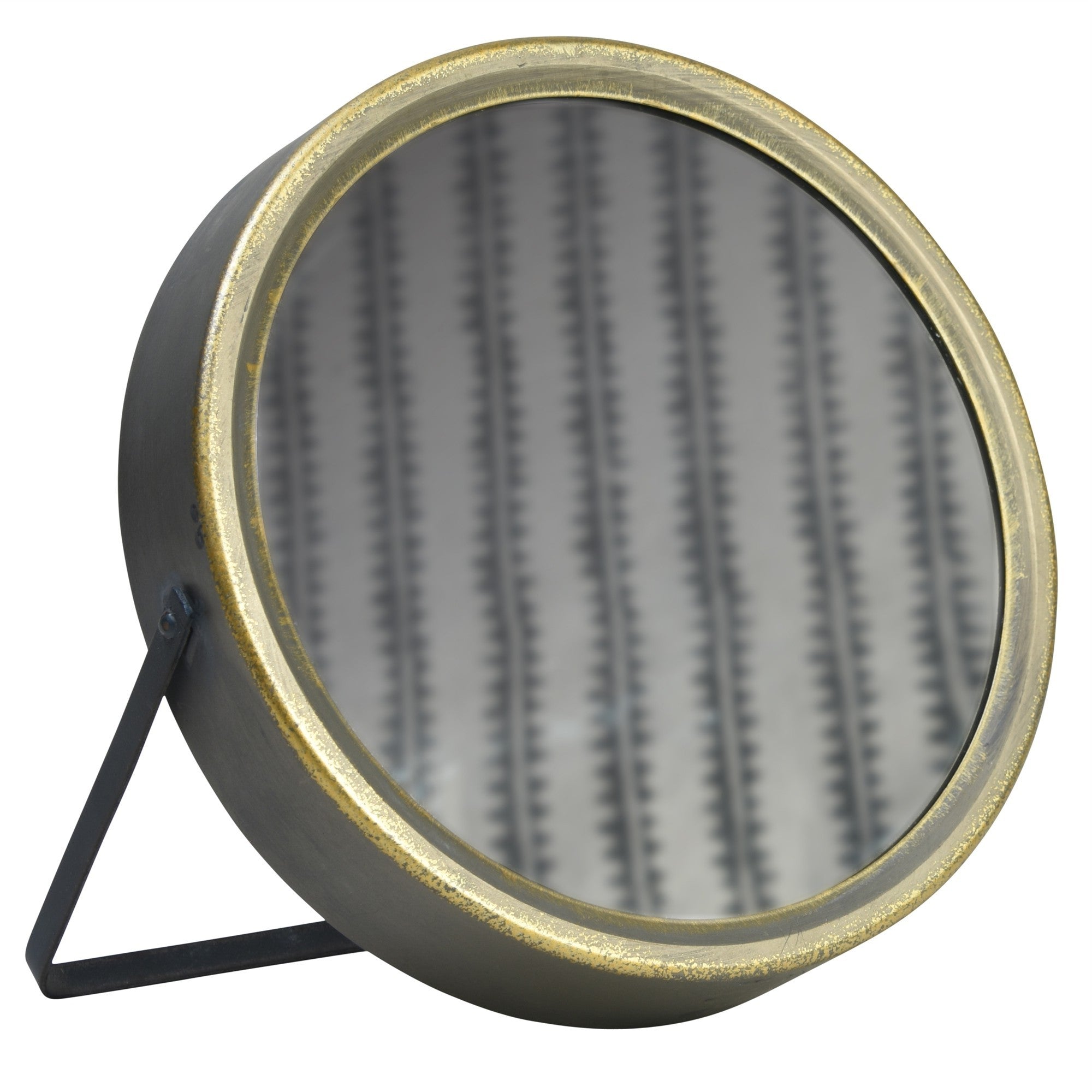 This minimalist styling with a touch of glam, Gray and Gold Tabletop Vanity Mirror is a perfect compliment to any vanity, bathroom counter, office desk, or nightstand. The easel metal frame supports the matte gray with gold tone trim small round mirror. Makes a great gift this versatile mirror is a great way to see yourself. 9" x 6" 9"
