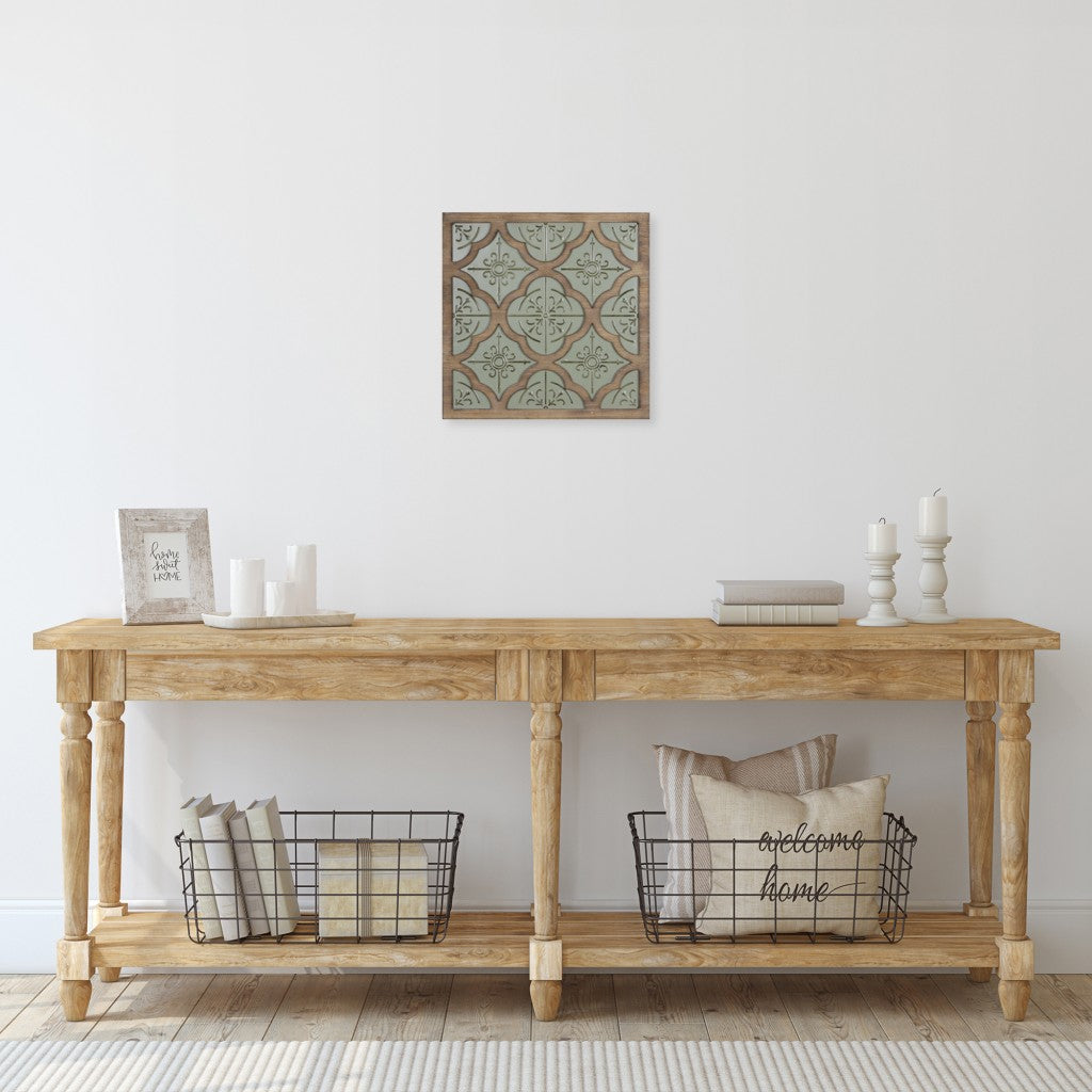 Elevate your surroundings with this Green Ethnic Pattern Wood and Metal Wall Plaque. This plaque is made from a mixture of wood and metal that gives it sturdiness while also keeping it light enough to hang securely. The background of this decor piece is made from solid wood and finished with a light brown varnish on top. The ethnic pattern on top is made from a matte green metal and has intricate detailing throughout. The ethnic pattern is inspired by Middle Eastern Art and the tile design will add the perfect touch of elegance to your walls. 15.75" H x 15.75" W x 1.25" D