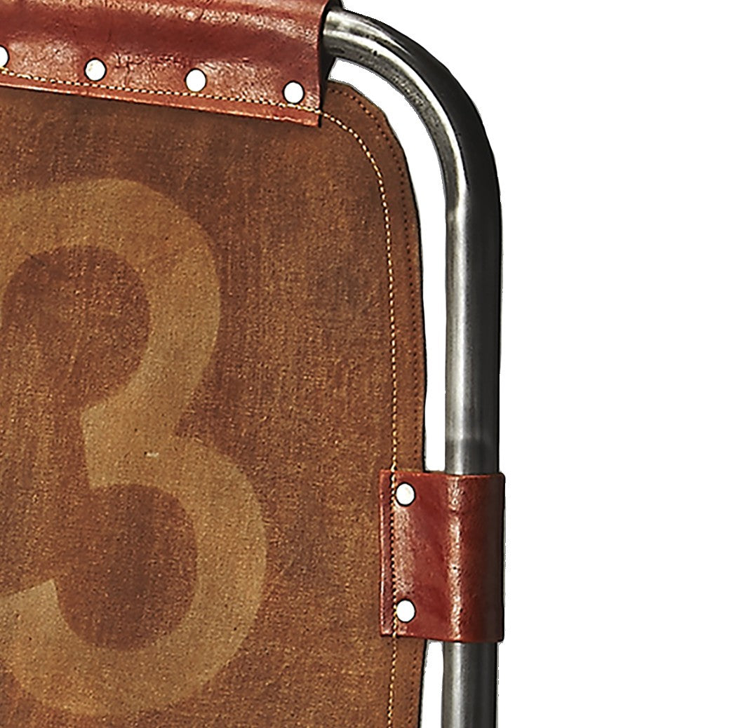 Reminiscent of a go cart seat, this numbered pattern Industrial Vintage Dining or Side Chair is quite unique. The canvas leather seating adds to its versatility with splayed metal legs for stability. Sophisticated rivets alternately affixed secure the canvas leather seat to the frame. Lightweight metal structure owes to it's easy portability as well. 35" x 20" x 22"