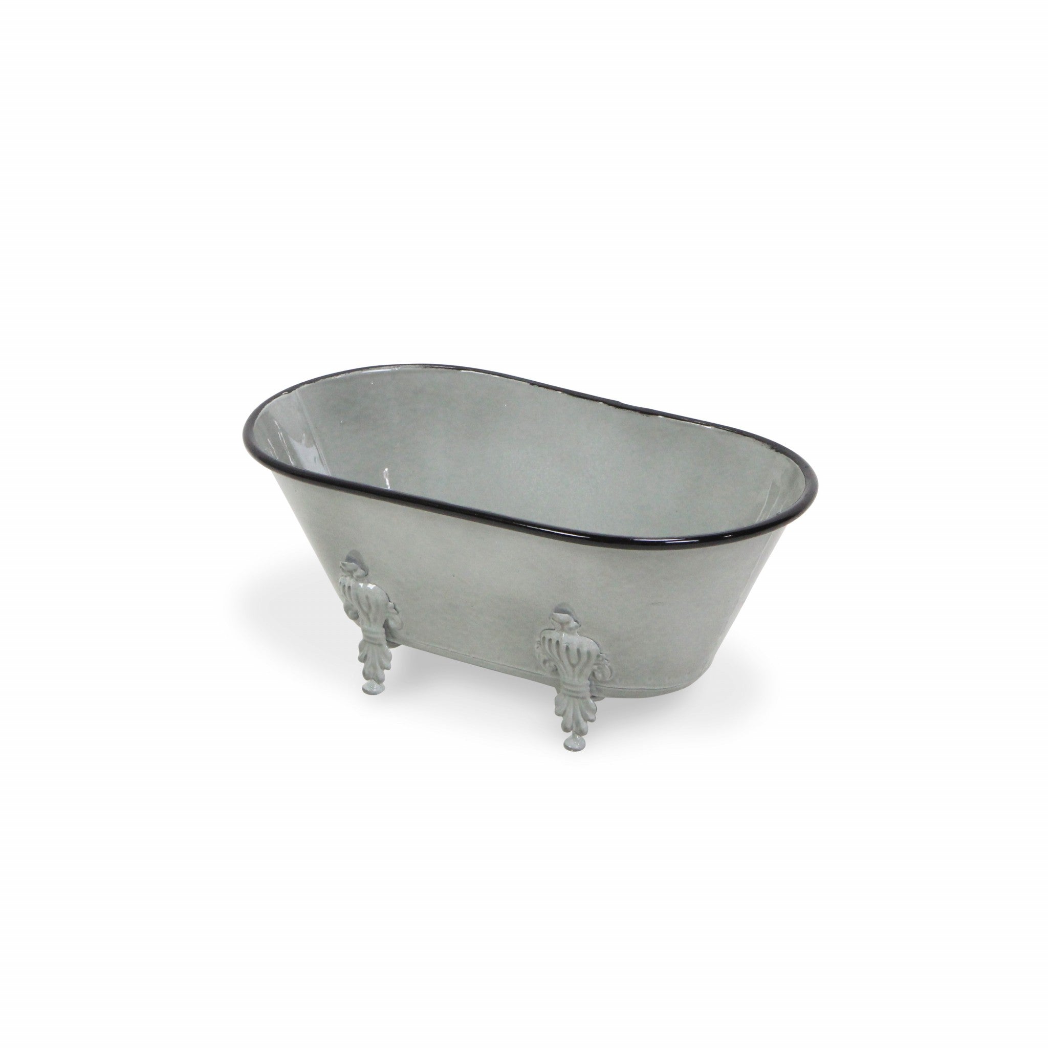 Add a whimsical touch to any space in your home with this Jumbo Light Gray Bathtub Decorative Sculpture. This piece is made from solid metal and is colored to a light gray finish. The claw foot bathtub shape has a black colored rim and four feet underneath which add a nice depth to the overall look. You can use this piece as decor around your home or you can line in with plastic and use it as a fun planter outdoors or indoors. 5" H x 12" W x 6.5" D