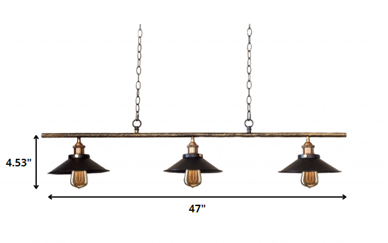 This is beautifully put together for a captivating and functional illumination. This lighting fixture possesses good quality of materials used and reflects its light perfectly.BlackEdison lightIncludes two (2) 30-inch chainsFixture finish: BlackShades: MetalNumber of lights: Three (3)Requires Three (3) 60-watt bulb (included)Line switchDimensions: 47 inches long x 9 inches wide x 30 inches highAssembly Required.This fixture does need to be hard wired. Professional installation is recommended.